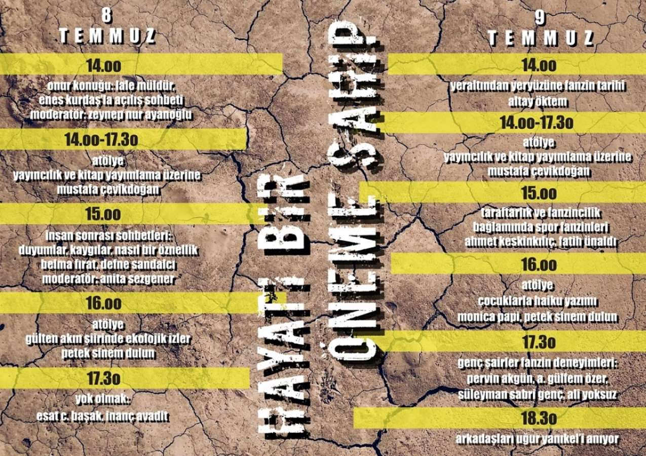Zeynep Nur Ayanoğlu moderatörlüğünde, onur konuğu Lale Müldür’ün Enes Kurdaş ile yapacağı “Hayati Öneme Sahip” başlıklı söyleşiyle açılacak program, Türkiye’deki sanatçılara “politik bir çerçevede, insan soyunun tüm sorunlarıyla birlikte ekoloji odağında genişleyen” bir dergi çağrısı ile kapanacak. Herkese açık ve ücretsiz yapılacak atölye çalışmaları 25 kişilik kontenjana sahip.