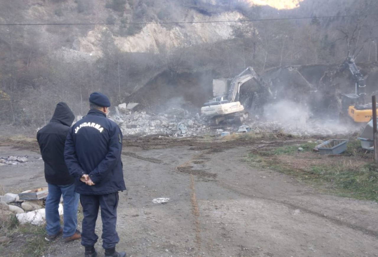 Doğa talanına karşı yöre halkının mücadelesi de devam ederken direniş alanında bulunan ve kullanılamayan çay fabrikası bu sabah acil kamulaştırma gerekçesiyle yıkıldı. Bilirkişi incelemesi sonucunda çıkan raporda taş ocağının zararları vurgulanırken kamyonların geçiş yolunu büyütmek amacıyla direniş alanına müdahale edilmesi yöre halkının tepkisine neden oldu.