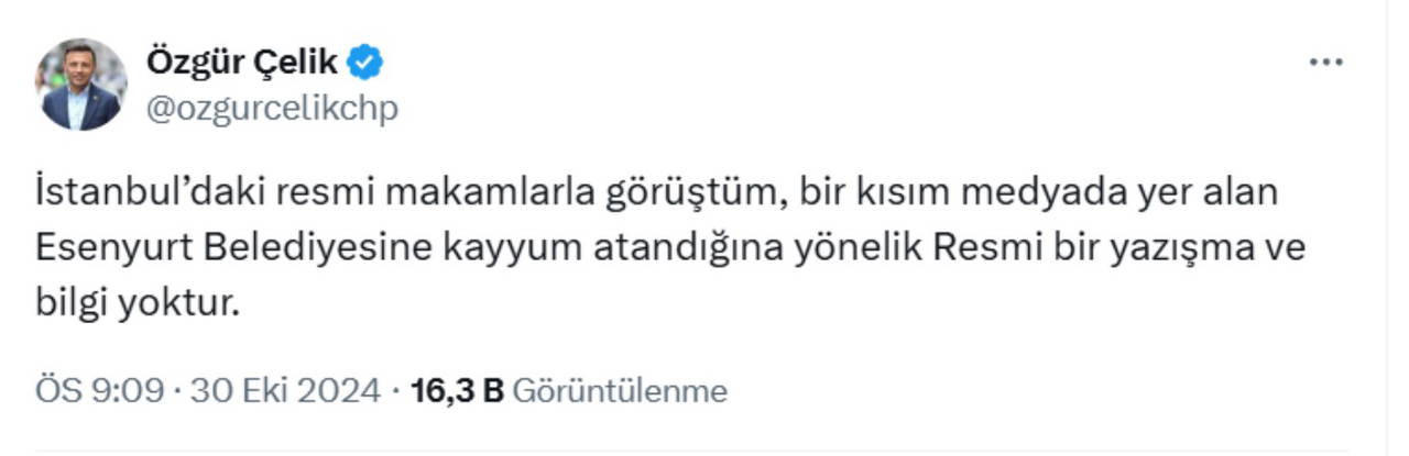 İktidara yakın Sabah gazetesinde Esenyurt Belediyesi'ne Beşiktaş Kaymakamı Oğuzhan Bingöl'ün kayyum olarak atandığı iddia edildi. Söz konusu habere ilişkin açıklama yapan CHP İstanbul İl Başkanı Özgür Çelik, iddianın gerçek olmadığını belirtti.