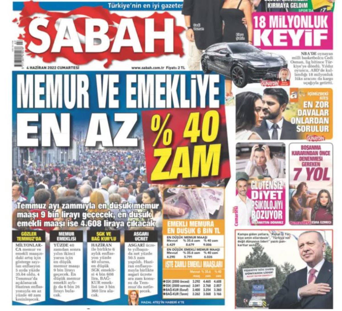 Manşetinde yüzde 73’ü aşan enflasyona değinmeyen Sabah gazetesi, "Memur ve emekliye en az yüzde 40 zam" haberini manşetten yayımladı.