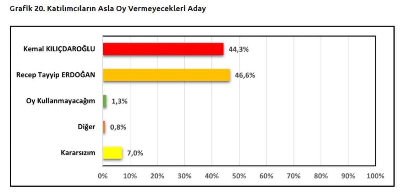 Araştırmaya katılanların yüzde 46,6’sı "Asla" Erdoğan'a oy vermeyeceğini belirtirken, yüzde 44,3’ü Kılıçdaroğlu'na oy vermeyeceğini söyledi. Kararsız olanların oranı ise yüzde 7 oldu.