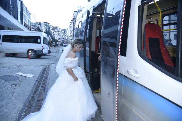 Artvinli Tolgahan Aydemir ile Adana’dan gelin gelen Şifa Kabayel, düğünleri için gelin arabası yerine, toplu taşıma kullanımına dikkat çekmek ve farkındalık oluşturmak amacıyla kuaförden düğün salonuna kadar dolmuş kullandı.