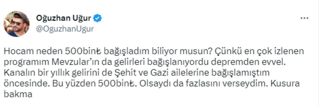 "Hocam neden 500 bin TL bağışladım biliyor musun? Çünkü en çok izlenen programım Mevzular’ın da gelirleri bağışlanıyordu depremden evvel. Kanalın bir yıllık gelirini de Şehit ve Gazi ailelerine bağışlamıştım öncesinde. Bu yüzden 500 bin TL. Olsaydı da fazlasını verseydim. Kusura bakma"
