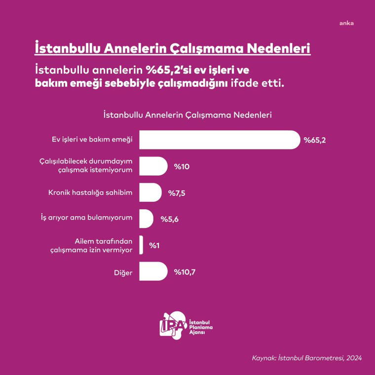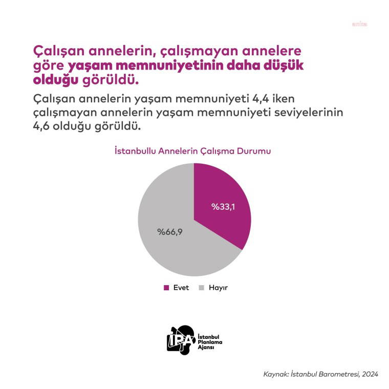 “İstanbullu annelerin yüzde 66,9'u çalışmayor, yüzde 33,1'i ise çalışıyor. Çalışan annelerin yaşam memnuniyeti 4,4 iken, çalışmayan annelerin 4,6'dır. İstanbullu annelerin yüzde 65,2'sinin çalışmama sebebi ev işleri ve bakım emeğiyken, diğer sebepler arasında iş bulamama (yüzde 5,6) ve aile izni olmaması (yüzde 1) bulunuyor.