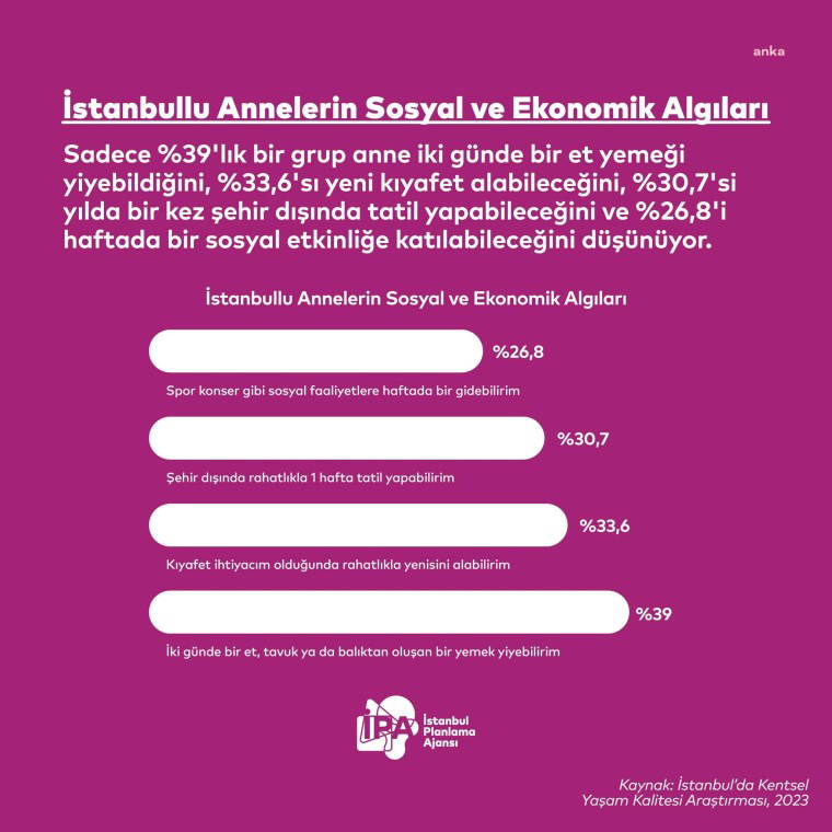 Son 3 ayda İstanbullu annelerin gündemi yüzde 52,2 ile ekonomik sorunlar ve yüzde 17,8 ile 31 Mart yerel seçimleri oldu. Ekonomik sıkıntılar altında, İstanbullu annelerin yalnızca yüzde 39'u her iki günde bir etli yemek yiyebiliyor. Annelerin, yüzde 33,6'sı yeni kıyafet alabileceğini, yüzde 30,7'si yılda bir haftalık tatil yapabileceğini düşünüyor.
