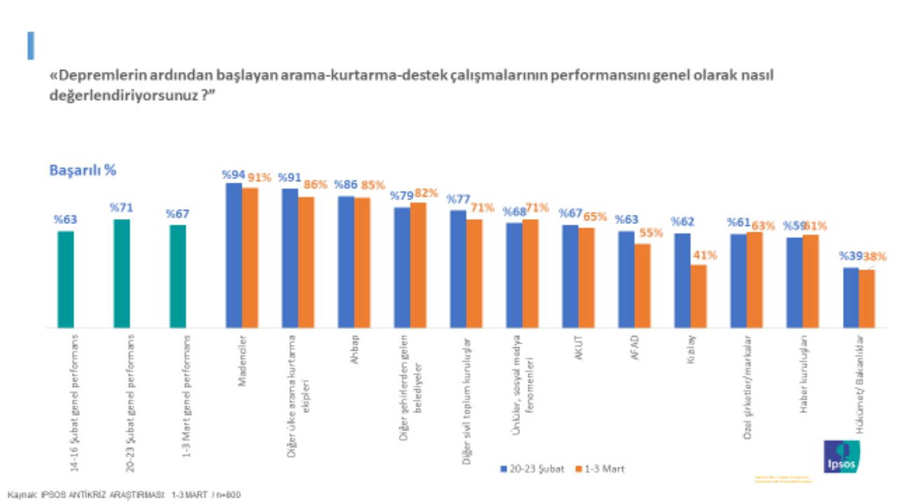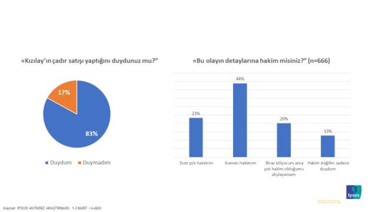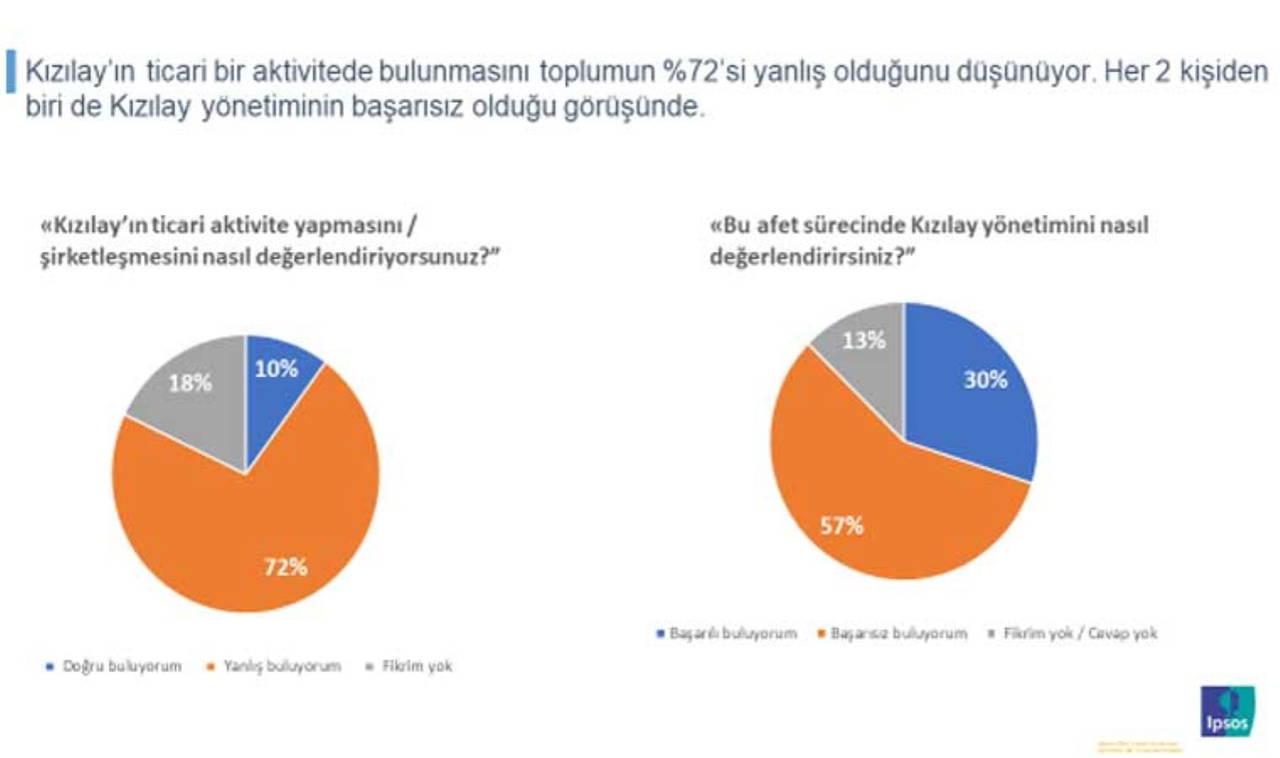Kahramanmaraş merkezli depremlerin ardından afet bölgesi ilan edilen 11 ilde, arama kurtarma çalışmaları yapıldı. Artçı depremlerin devam ettiği afet bölgesinde, Kızılay'ın gıda ve çadır sattığı ortaya çıktıktan sonra Kızılay'ın aktifliği yurttaşlar tarafından sorgulanmaya başladı. Ipsos tarafından yapılan sonra araştırmalarda toplumda her iki kişiden birinin Kızılay'ın afet yönetimini başarız olduğunu ve ticari faaliyette bulunmasını yanlış olduğunu düşündüklerini kaydetti.