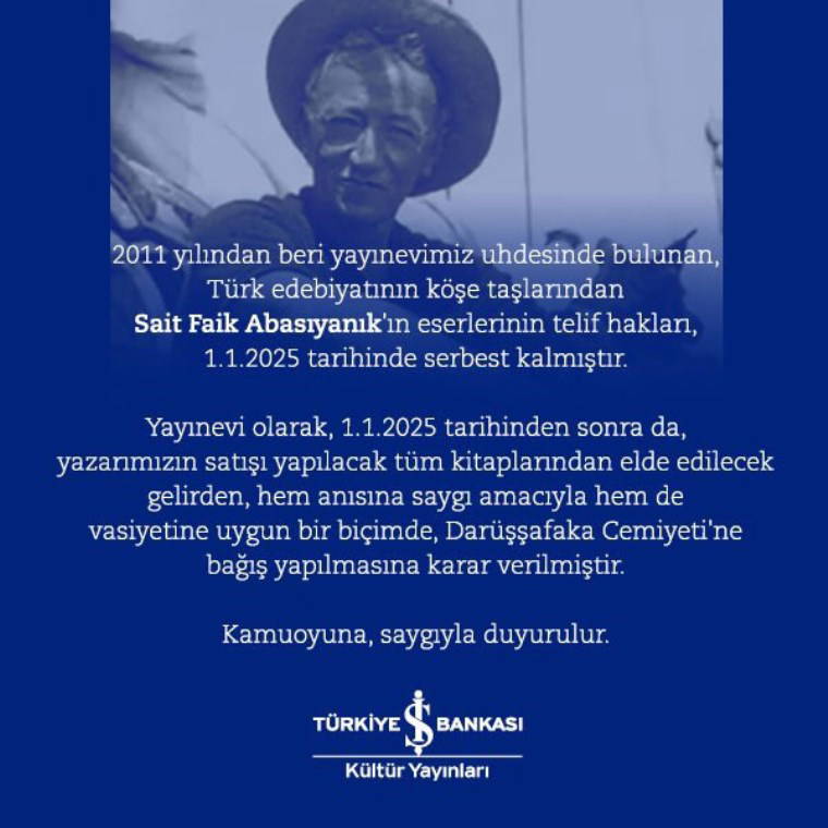 Yayınevi, 1 Ocak 2025 tarihinden sonra da Sait Faik’in eserlerinden elde edilecek gelirlerin büyük yazarın vasiyetine uygun şekilde Darüşşafaka Cemiyeti’ne bağışlamaya devam edeceklerini bildirdi.