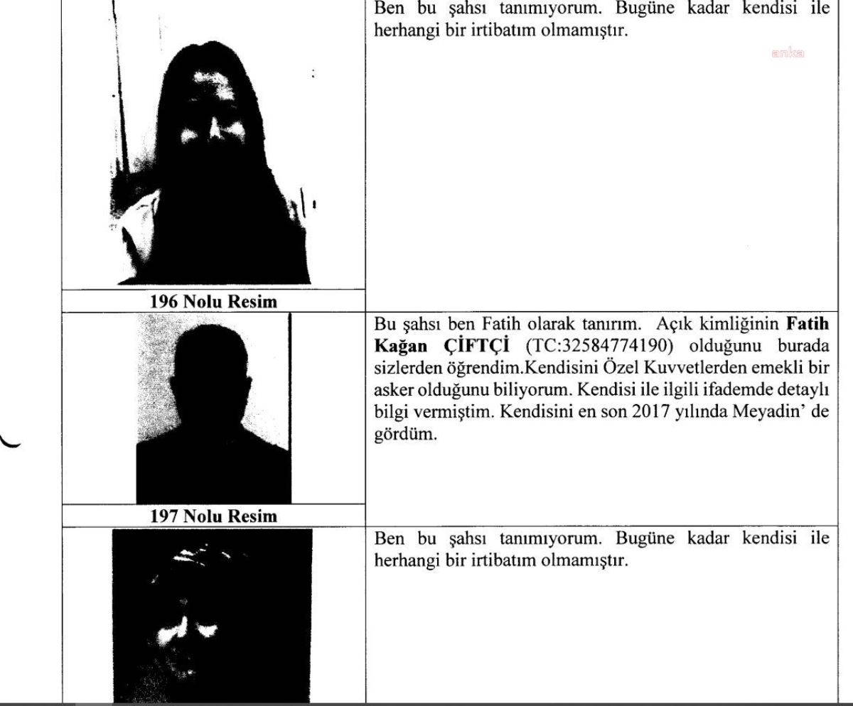 “Bu şahsı ben Fatih olarak tanırım. Açık kimliğinin Fatih Kağan Çiftçi olduğunu burada sizlerden öğrendim. Kendisini özel kuvvetlerden emekli bir asker olduğunu biliyorum. Kendisi ile ilgili bir ifademde detaylı bilgi vermiştim. Kendisini en son 2017 yılında Meyadin’de gördüm.”