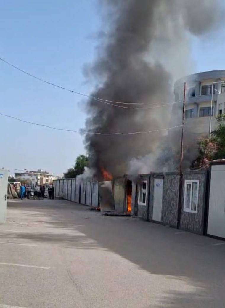 Kahramanmaraş merkezli 6 Şubat 2023 depremleri sonrasında hasarın meydana geldiği hastanenin bahçesine yerleştirilen konteynerler henüz bilinmeyen bir nedenle alev aldı.