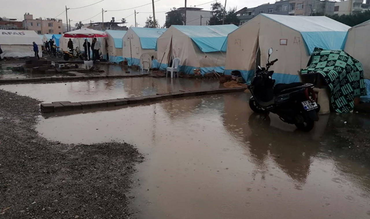 İskenderun'da öğle saatlerinde başlayan şiddetli yağış hayatı olumsuz etkiledi. Kahramanmaraş merkezli büyük depremlerden etkilenen ve evleri hasar alan depremzede vatandaşların yaşadığı ilçenin çeşitli yerlerinde bulunan çadır kentlerin ve konteynerlerin etrafı ise çamur oldu.