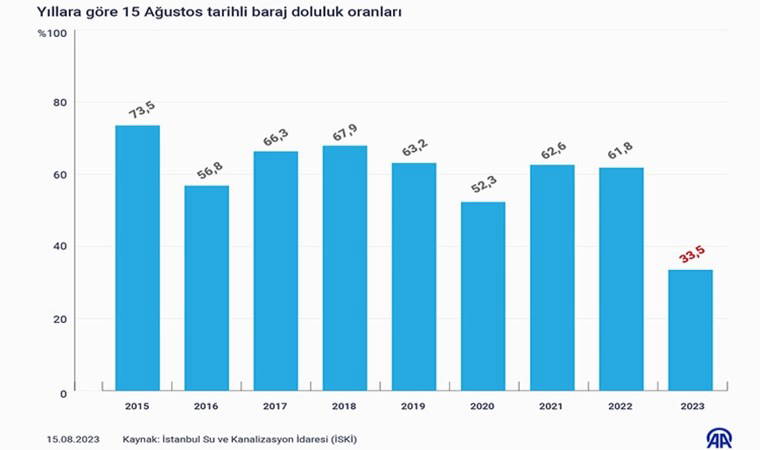 İstanbul'a su sağlayan barajların su miktarı yüzde 51.36 seviyesine kadar geriledi. Şehrin barajlarının doluluk oranı 3 Ağustos 2024 tarihinde yüzde 57 seviyesindeydi.