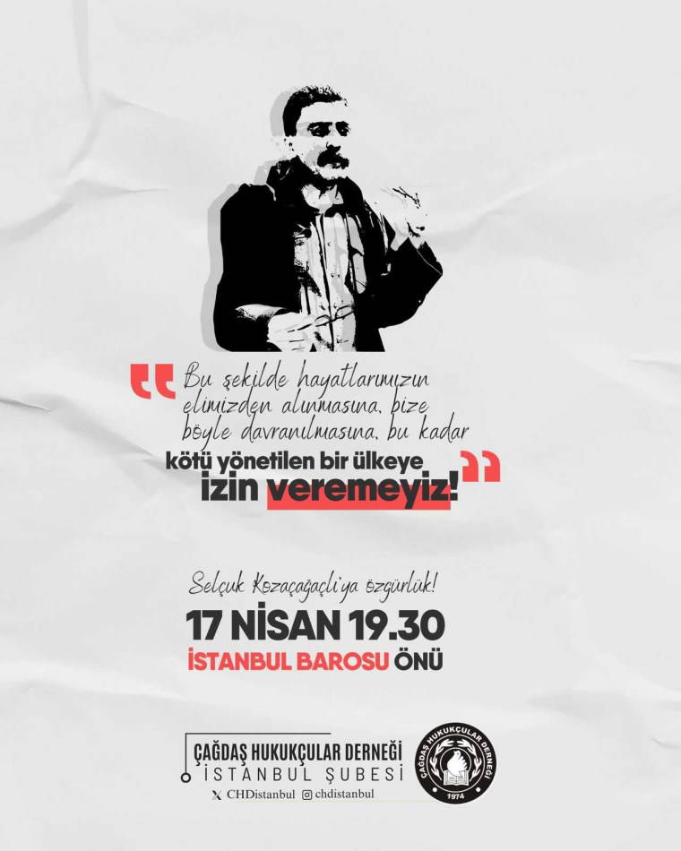 Çağdaş Hukukçular Derneği, Selçuk Kozağaçlı'nın tutuklanmasını protesto etmek için, "Avukat Selçuk Kozağaçlı yeniden tutuklanarak Silivri Hapishanesine gönderildi. Devrimci avukatlar onurumuzdur! Pespaye kararlarınızı tanımıyoruz. Tüm arkadaşlarımızı alacağız, biz kazanacağız!" ifadelerini kullanmış ve İstanbul Barosu önünde toplanacaklarını açıklamıştı.