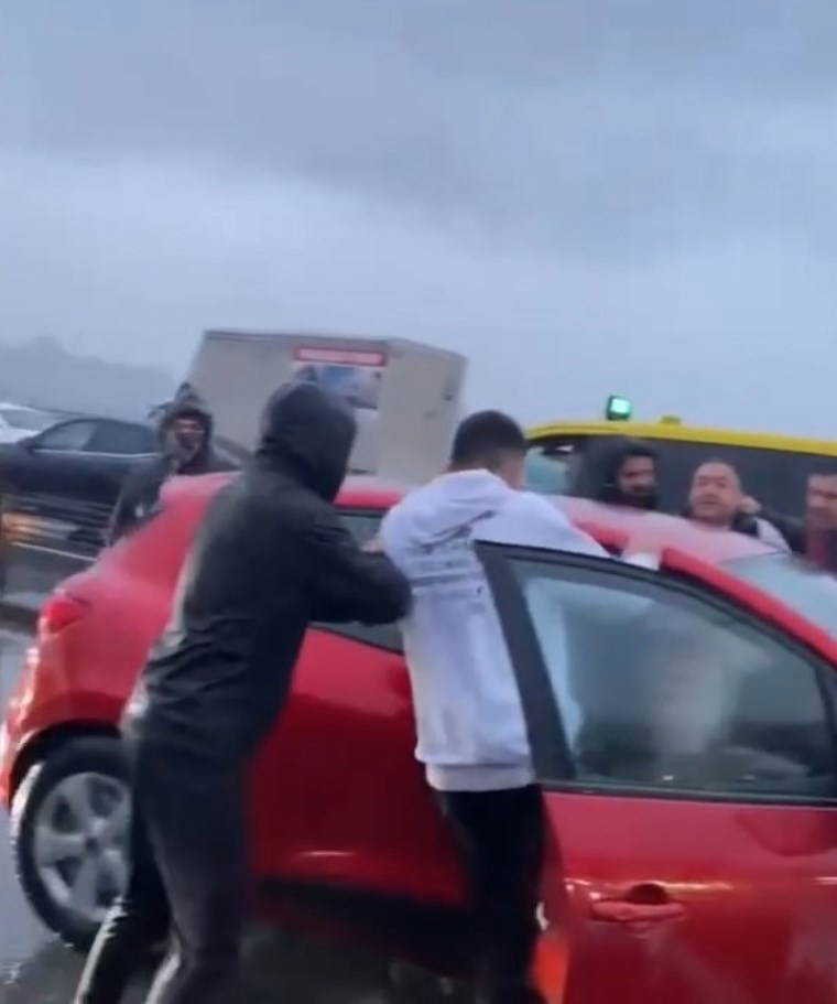 Görüntülerde sürücüler arasında yaşanan tartışmanın kavgaya döndüğü anlar görülüyor.Çevredekilerin araya girmesiyle kavga sona eriyor.