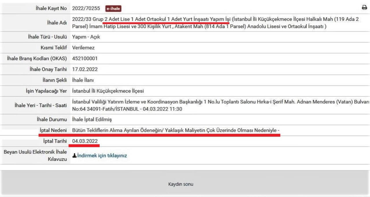 İstanbul Valiliği Yatırım İzleme ve Koordinasyon Başkanlığı, geçen yıl aralık ayında 38 ilkokul, 23 ortaokul ve 4 anaokulunu kapsayan 21 ihaleyi iptal etmişti. Aralık ayında iptal edilen ihaleler için, “Bütün tekliflerin alıma ayrılan ödeneğin/yaklaşık maliyetin çok üzerinde olması nedeniyle” şeklinde gerekçe belirtirken, daha sonra iptal edilen ihalelerin gerekçelerinde ise şöyle denilmişti: