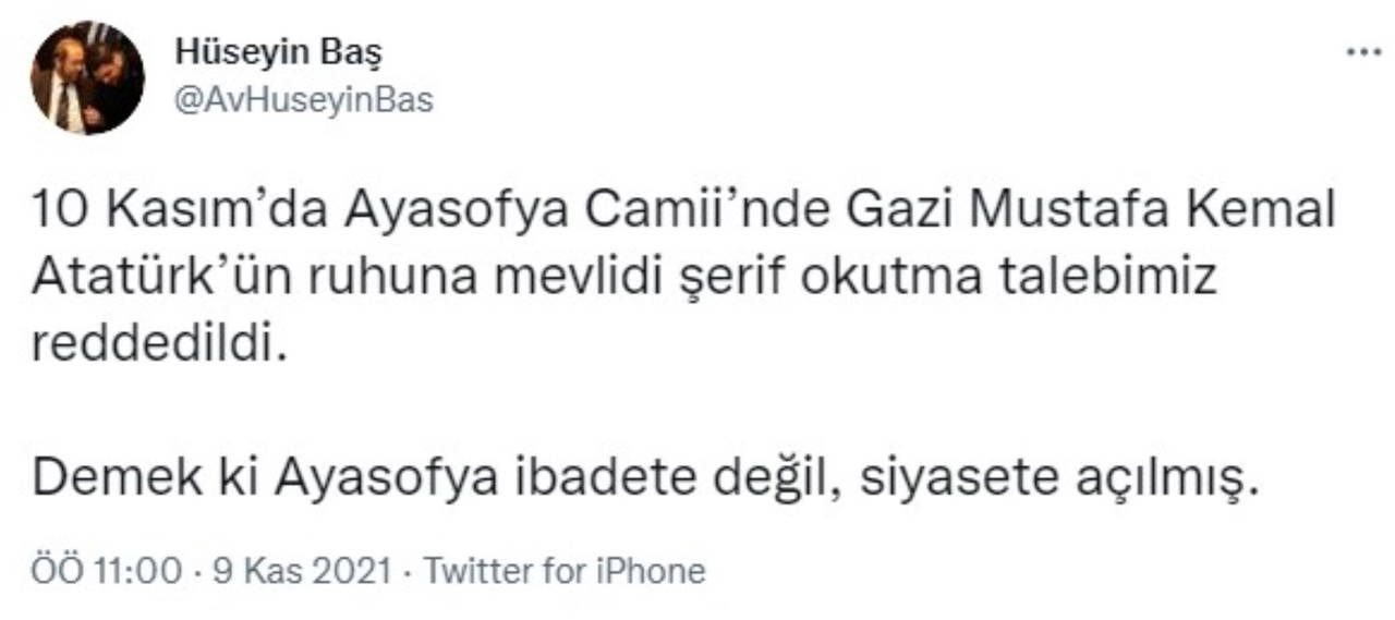 Hüseyin Baş bugün sosyal medya hesabından, “10 Kasım’da Ayasofya Camii’nde Gazi Mustafa Kemal Atatürk’ün ruhuna mevlidi şerif okutma talebimiz reddedildi. Demek ki Ayasofya ibadete değil, siyasete açılmış.“diyerek duyurdu.