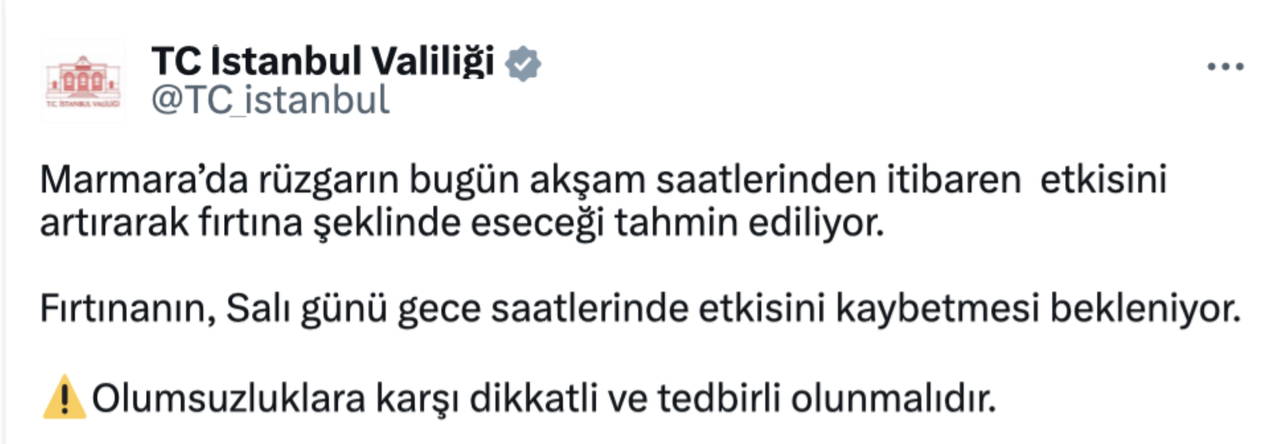 İstanbul Valiliği'nin sosyal medya hesabından yapılan paylaşımda, Marmara Bölgesi'nde rüzgarın akşam saatlerinden itibaren etkisini artırarak fırtına şeklinde eseceğinin tahmin edildiği belirtildi.