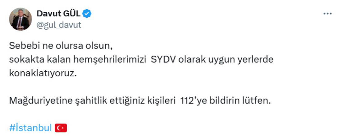 Sokakta kalan İstanbullulara konaklama hizmeti verildiğini anımsatan Gül, "Sebebi ne olursa olsun, sokakta kalan hemşehrilerimizi Sosyal Yardımlaşma ve Dayanışma Vakfı (SYDV) olarak uygun yerlerde konaklatıyoruz" ifadelerini kullandı.