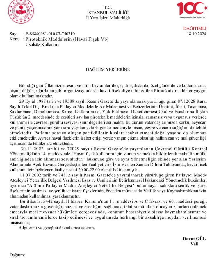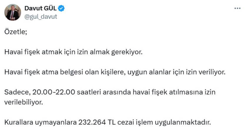 Vali Gül, sosyal medya hesabından yaptığı paylaşımda, havai fişek atmak için izin almak gerektiğini belirterek, "Havai fişek atma belgesi olan kişilere, uygun alanlar için izin veriliyor. Sadece, 20.00-22.00 saatleri arasında havai fişek atılmasına izin verilebiliyor. Kurallara uymayanlara 232 bin 264 lira cezai işlem uygulanmaktadır" ifadelerine yer verdi.
