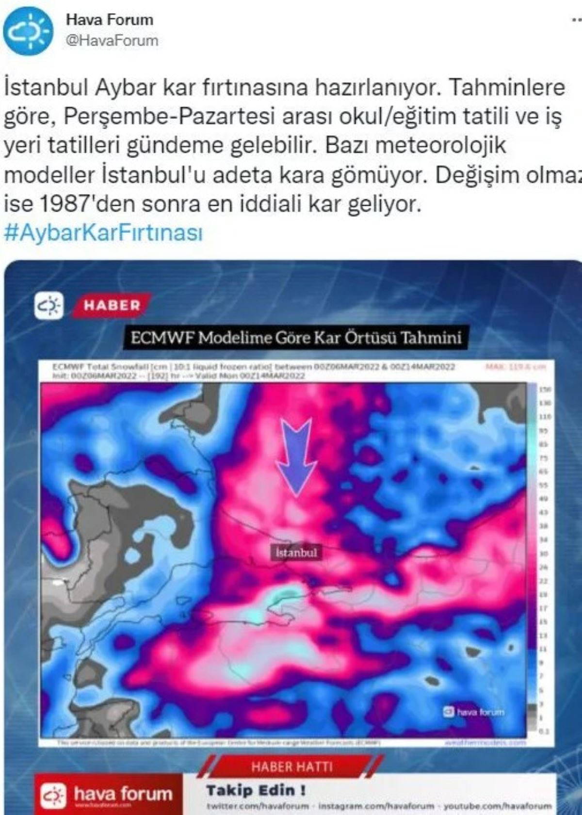 Hava Forum sitesinin yaptığı açıklamada, “İstanbul Aybar kar fırtınasına hazırlanıyor. Tahminlere göre, Perşembe-Pazartesi arası okul/eğitim tatili ve iş yeri tatilleri gündeme gelebilir. Bazı meteorolojik modeller İstanbul'u adeta kara gömüyor. Değişim olmaz ise 1987'den sonra en iddialı kar geliyor” ifadeleri kullanıldı.
