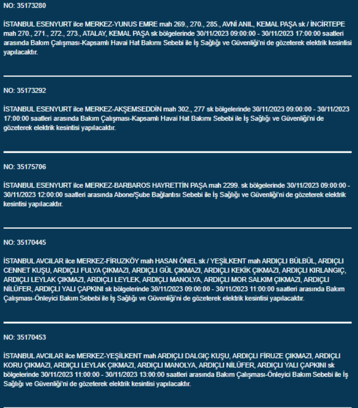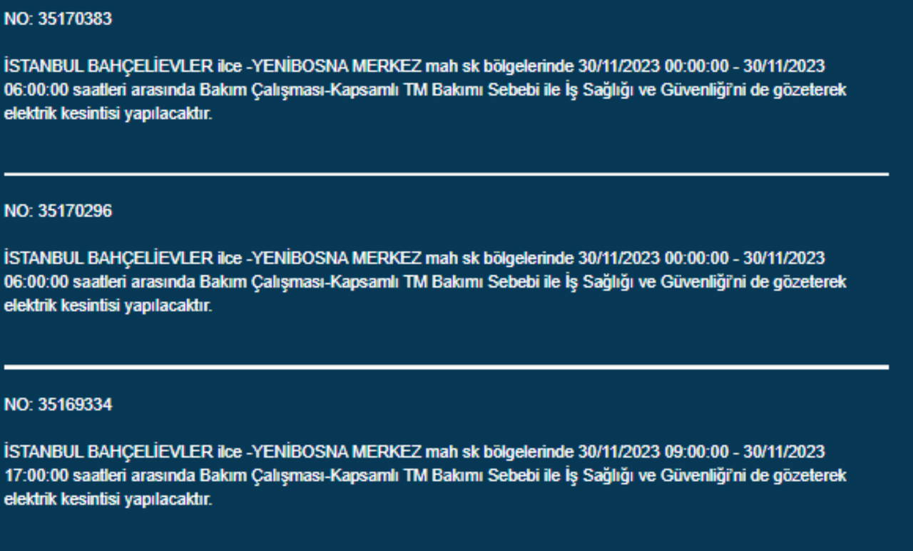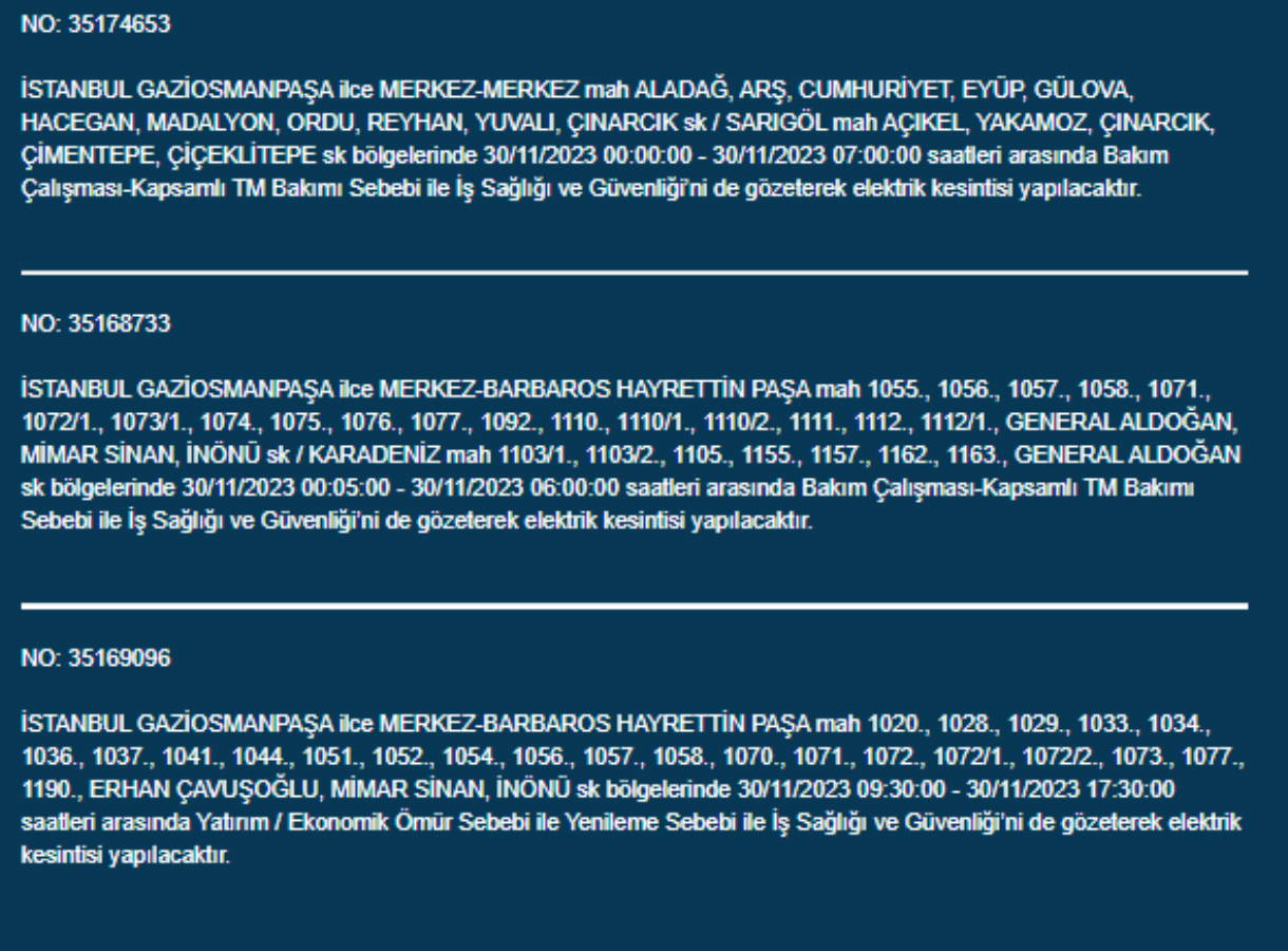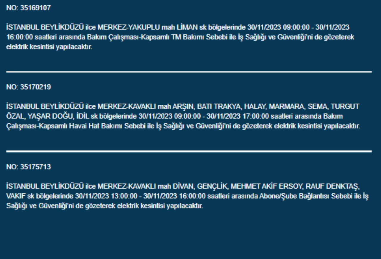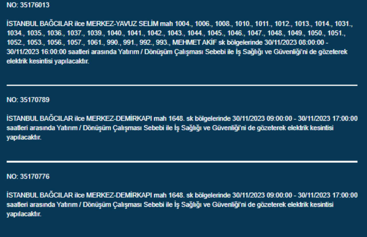 Boğaziçi Elektrik Dağıtım A.Ş, (BEDAŞ) İstanbul'da 30 Kasım Perşembe günü elektrik kesintileri uygulanacak ilçe ve sokakları paylaştı. Yurttaşlar, nerede elektriklerin kesileceğini ve ne zaman geleceğini merak etti. Peki, 30 Kasım Perşembe elektrik kesintilerinin yapılacağı ilçeler hangileri? İstanbul'da elektrikler ne zaman gelecek?