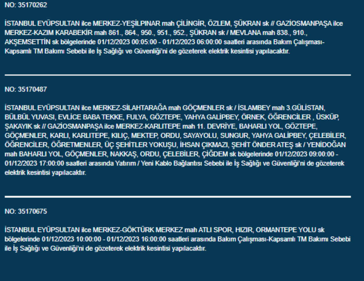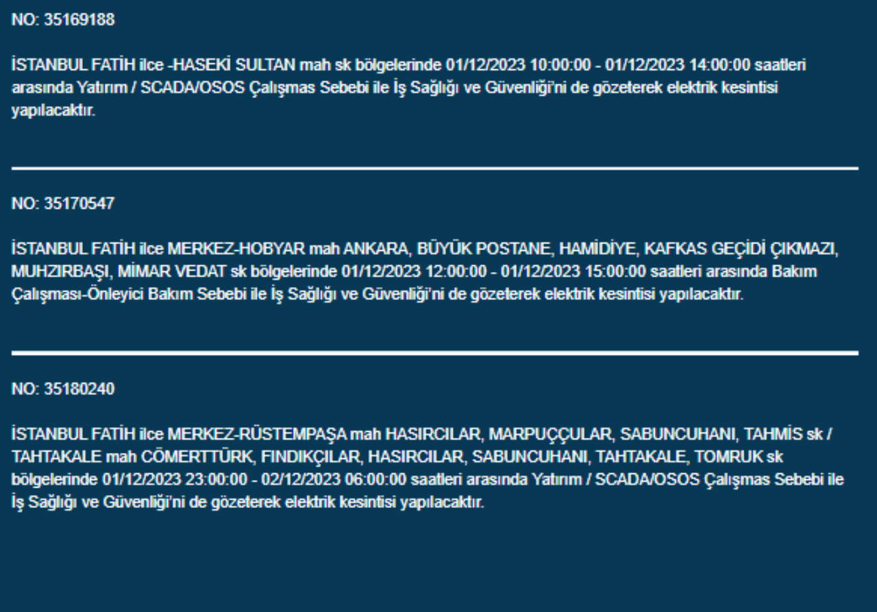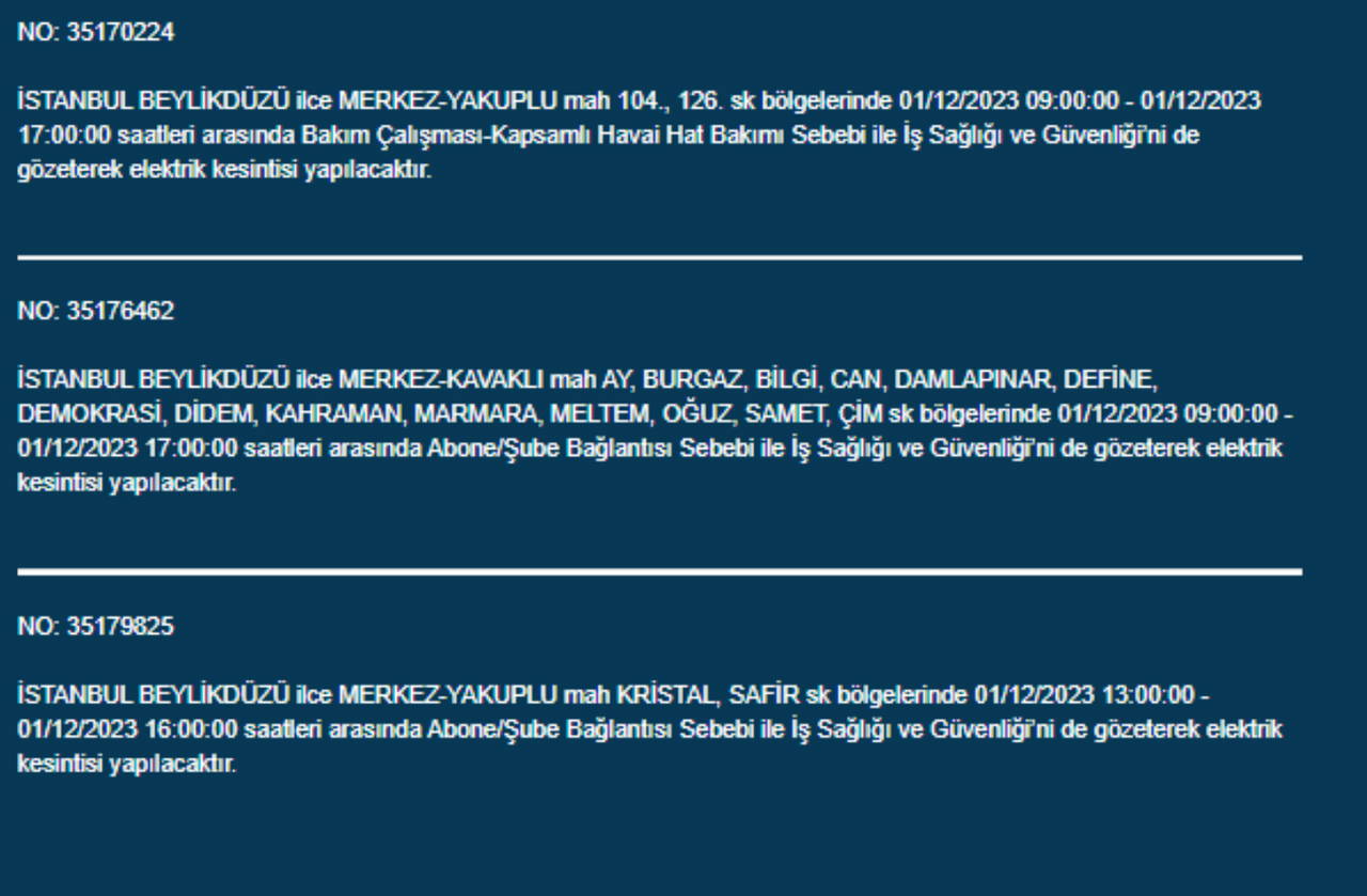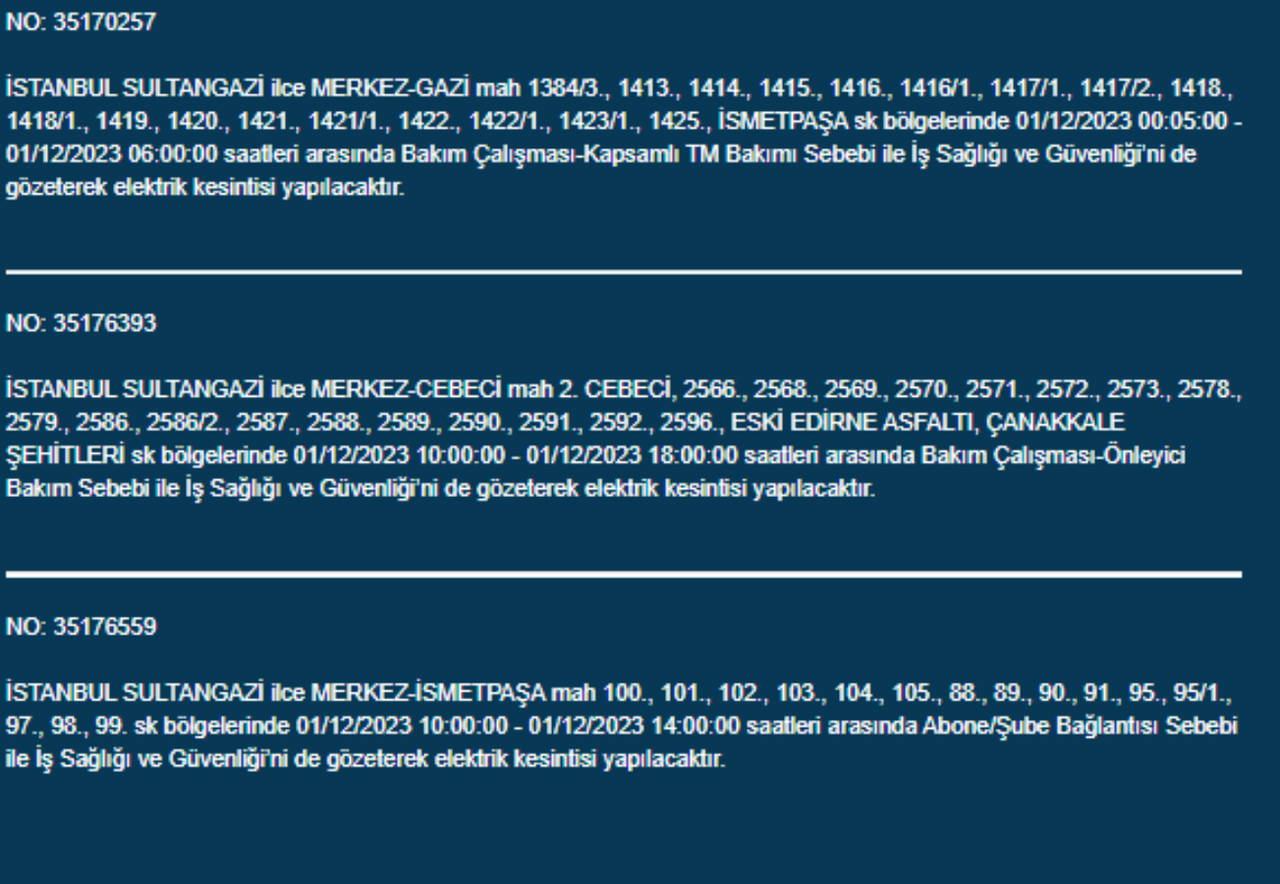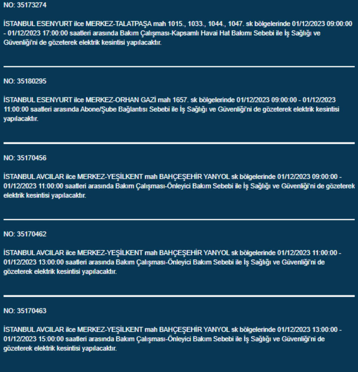 Boğaziçi Elektrik Dağıtım A.Ş, (BEDAŞ) İstanbul'da 1 Cuma Aralık günü elektrik kesintileri uygulanacak ilçe ve sokakları paylaştı. Yurttaşlar, nerede elektriklerin kesileceğini ve ne zaman geleceğini merak etti. Peki, 1 Aralık Cuma elektrik kesintilerinin yapılacağı ilçeler hangileri? İstanbul'da elektrikler ne zaman gelecek?