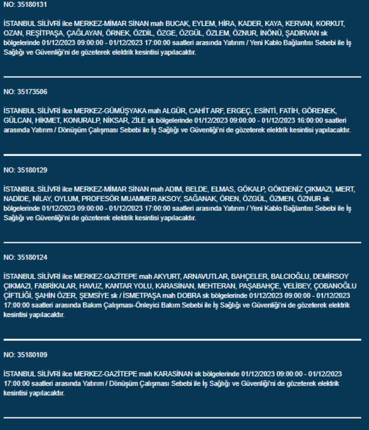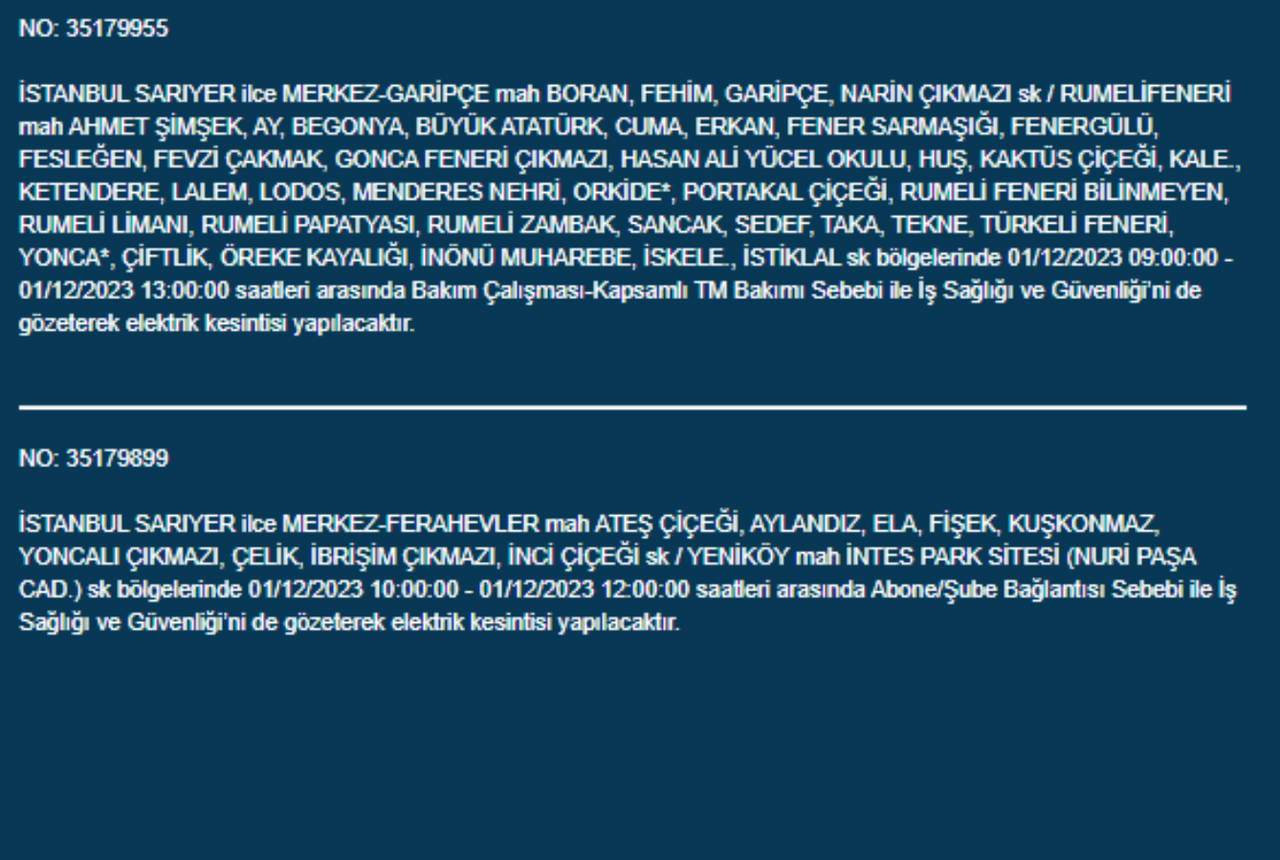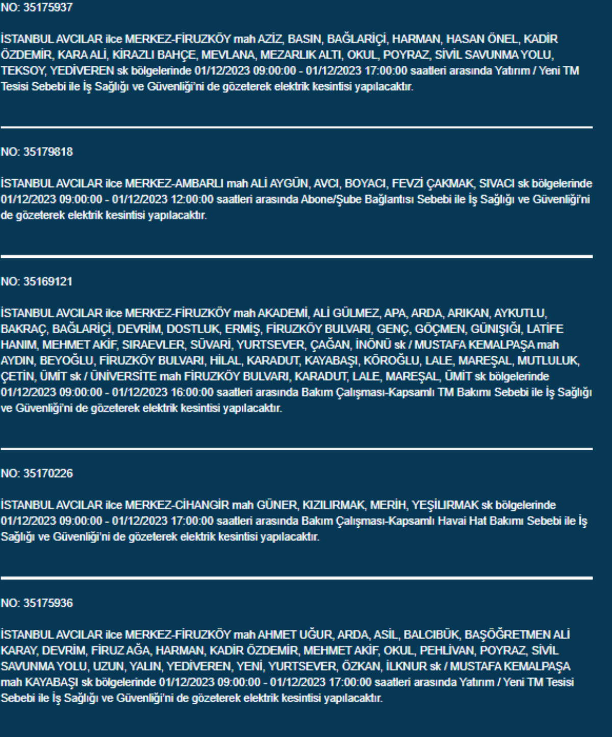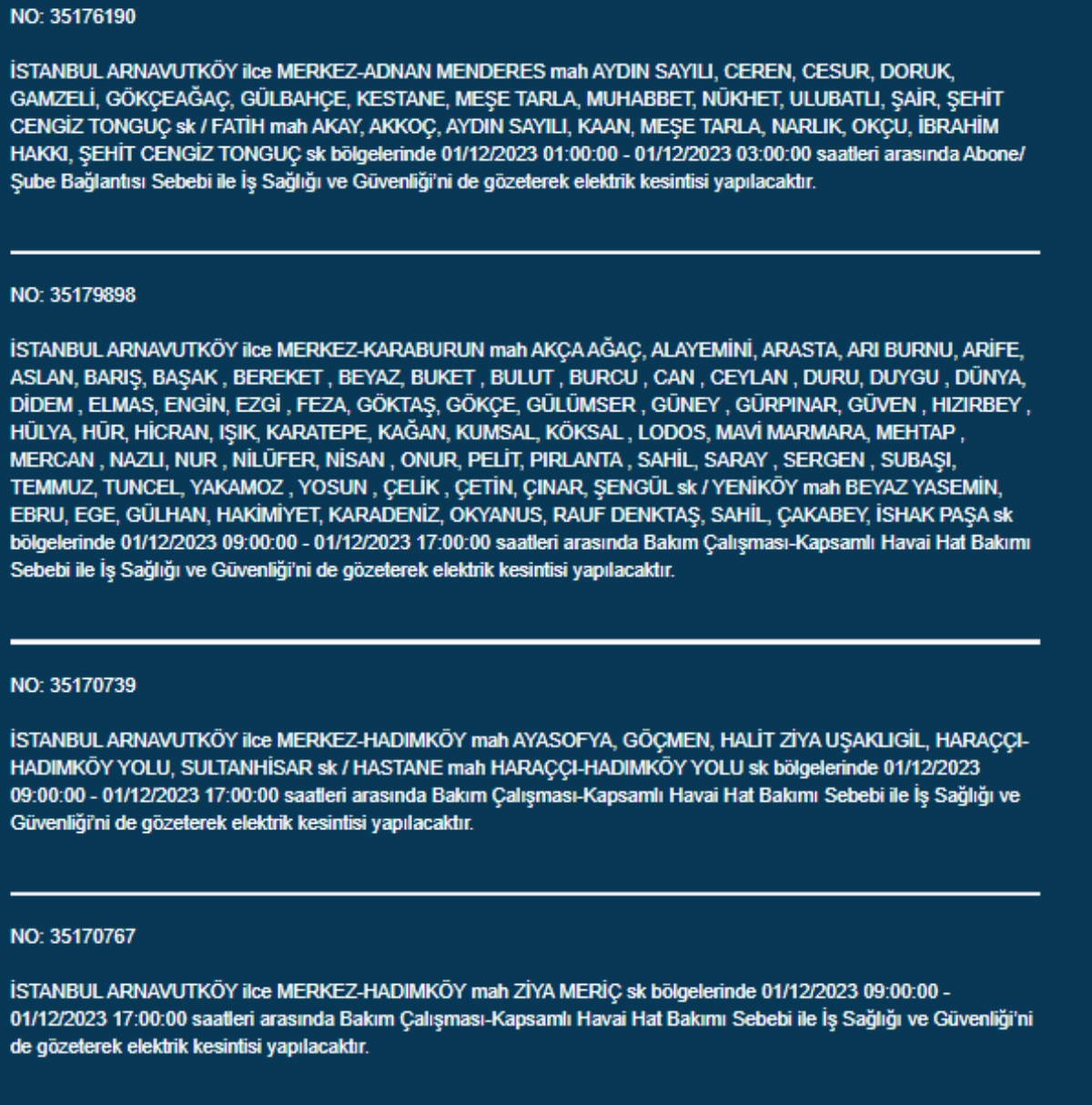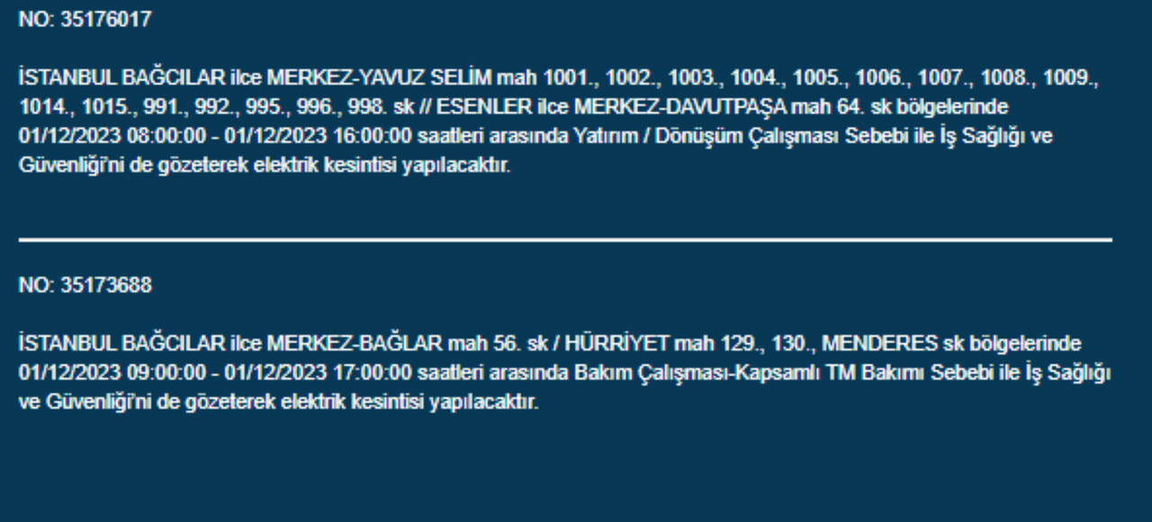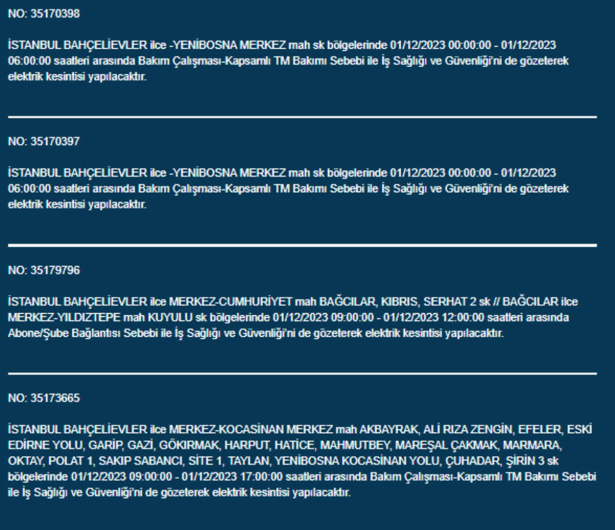 Boğaziçi Elektrik Dağıtım A.Ş, (BEDAŞ) İstanbul'da 1 Cuma Aralık günü elektrik kesintileri uygulanacak ilçe ve sokakları paylaştı. Yurttaşlar, nerede elektriklerin kesileceğini ve ne zaman geleceğini merak etti. Peki, 1 Aralık Cuma elektrik kesintilerinin yapılacağı ilçeler hangileri? İstanbul'da elektrikler ne zaman gelecek?