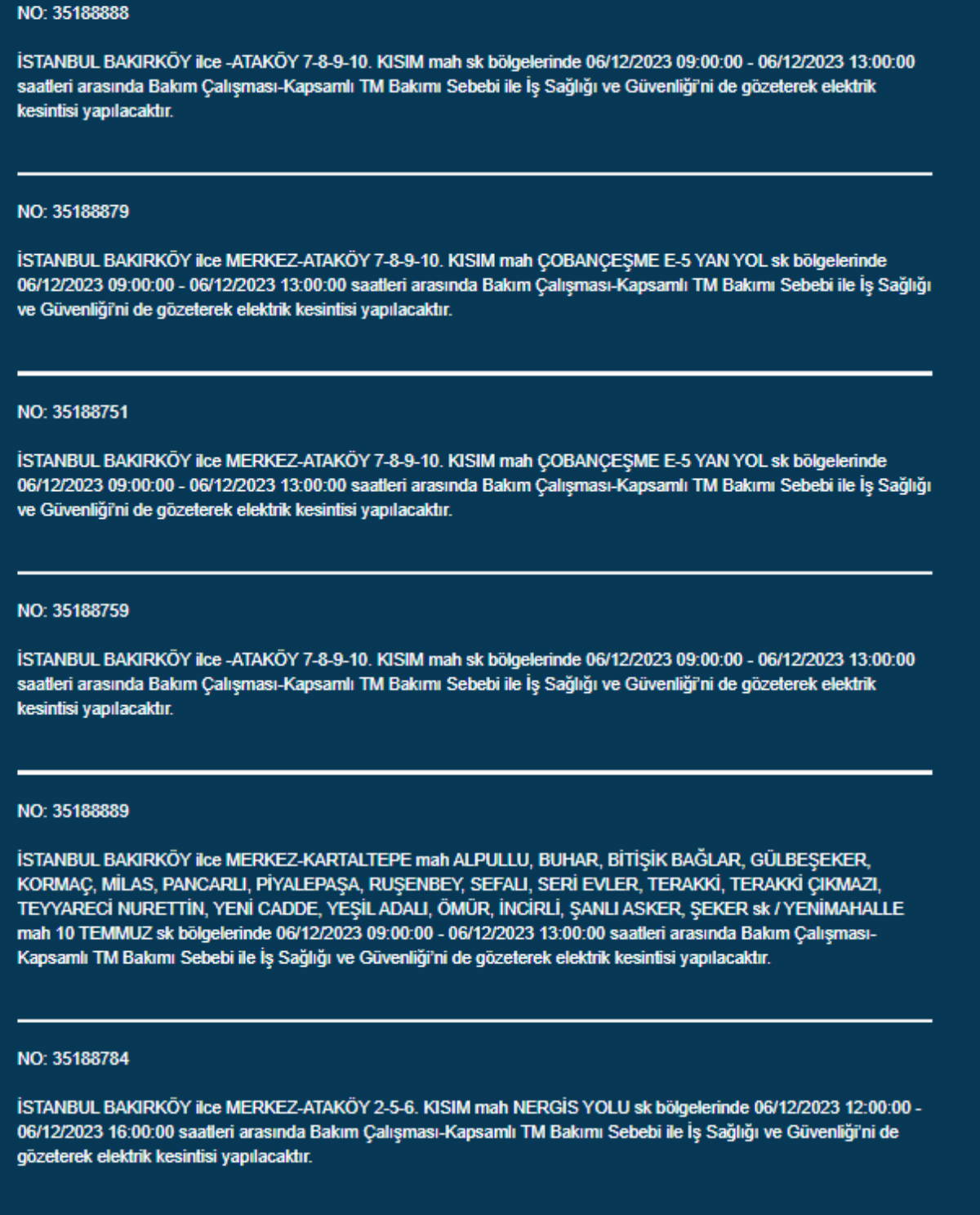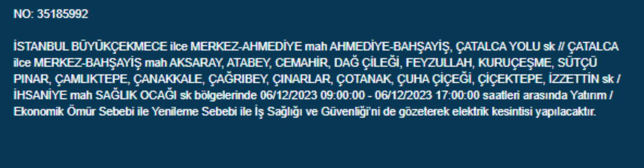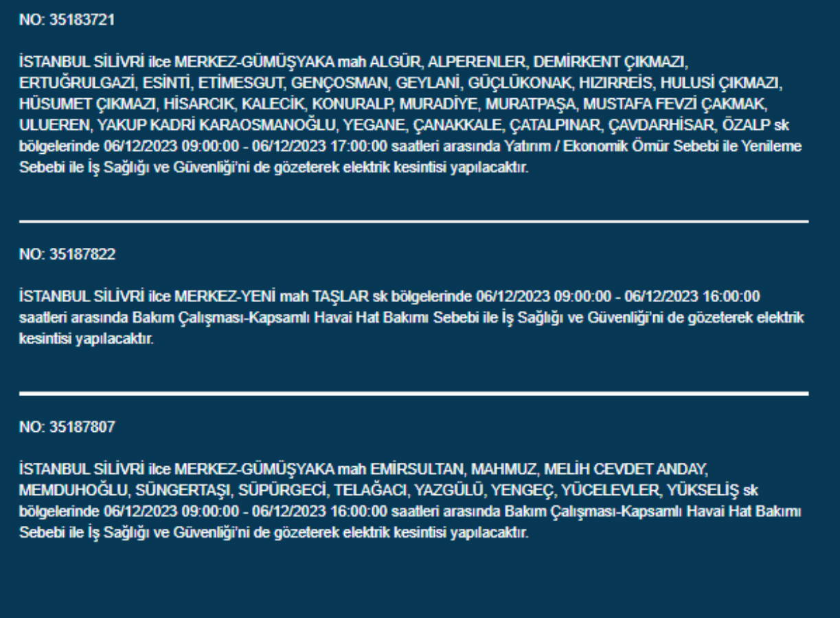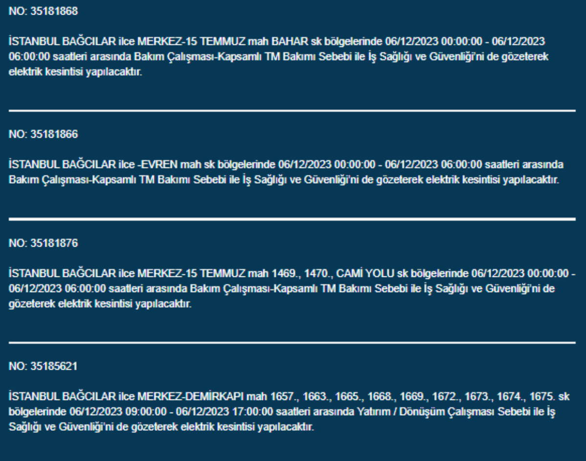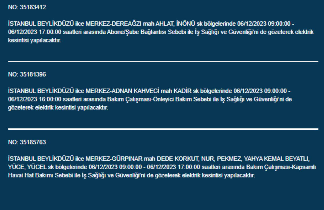 Boğaziçi Elektrik Dağıtım A.Ş, (BEDAŞ) İstanbul'da 6 Aralık Çarşamba günü elektrik kesintileri uygulanacak ilçe ve sokakları paylaştı. Yurttaşlar, nerede elektriklerin kesileceğini ve ne zaman geleceğini merak etti. Peki, İstanbul'da bugün elektrik kesintisi yaşanacak ilçeler hangileri? İstanbul'da elektrikler ne zaman gelecek?