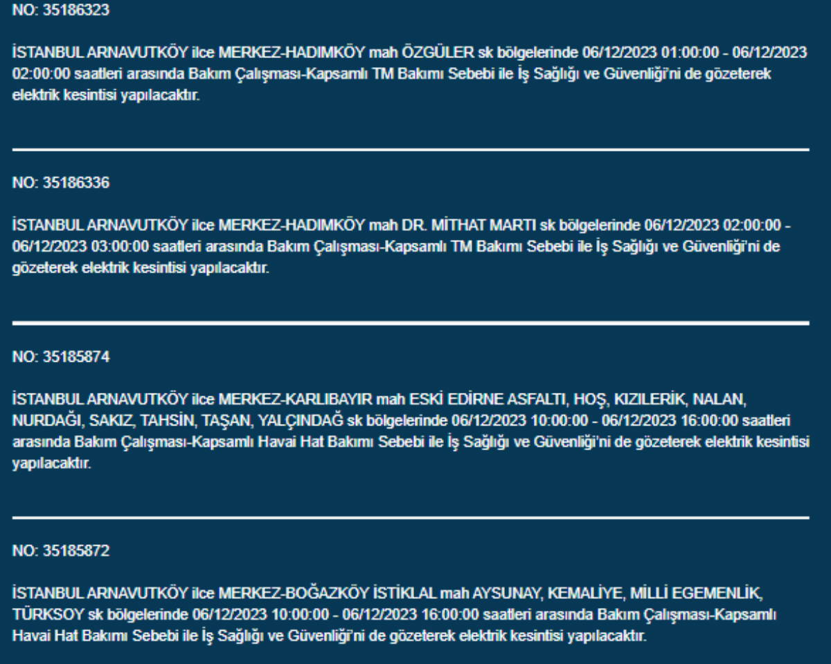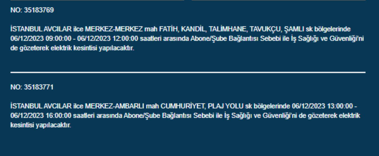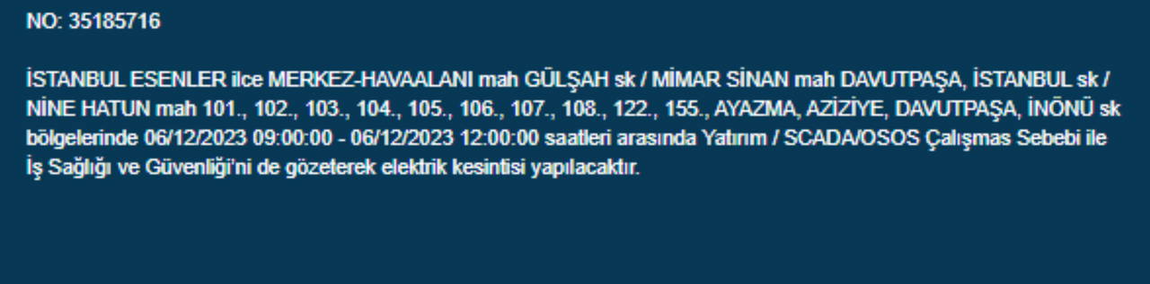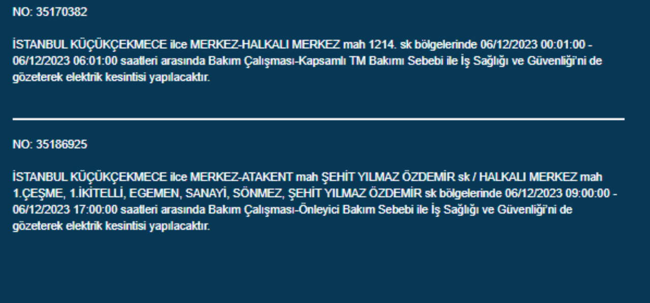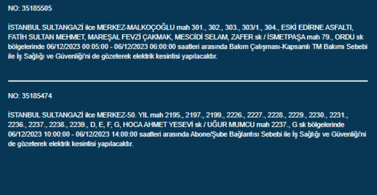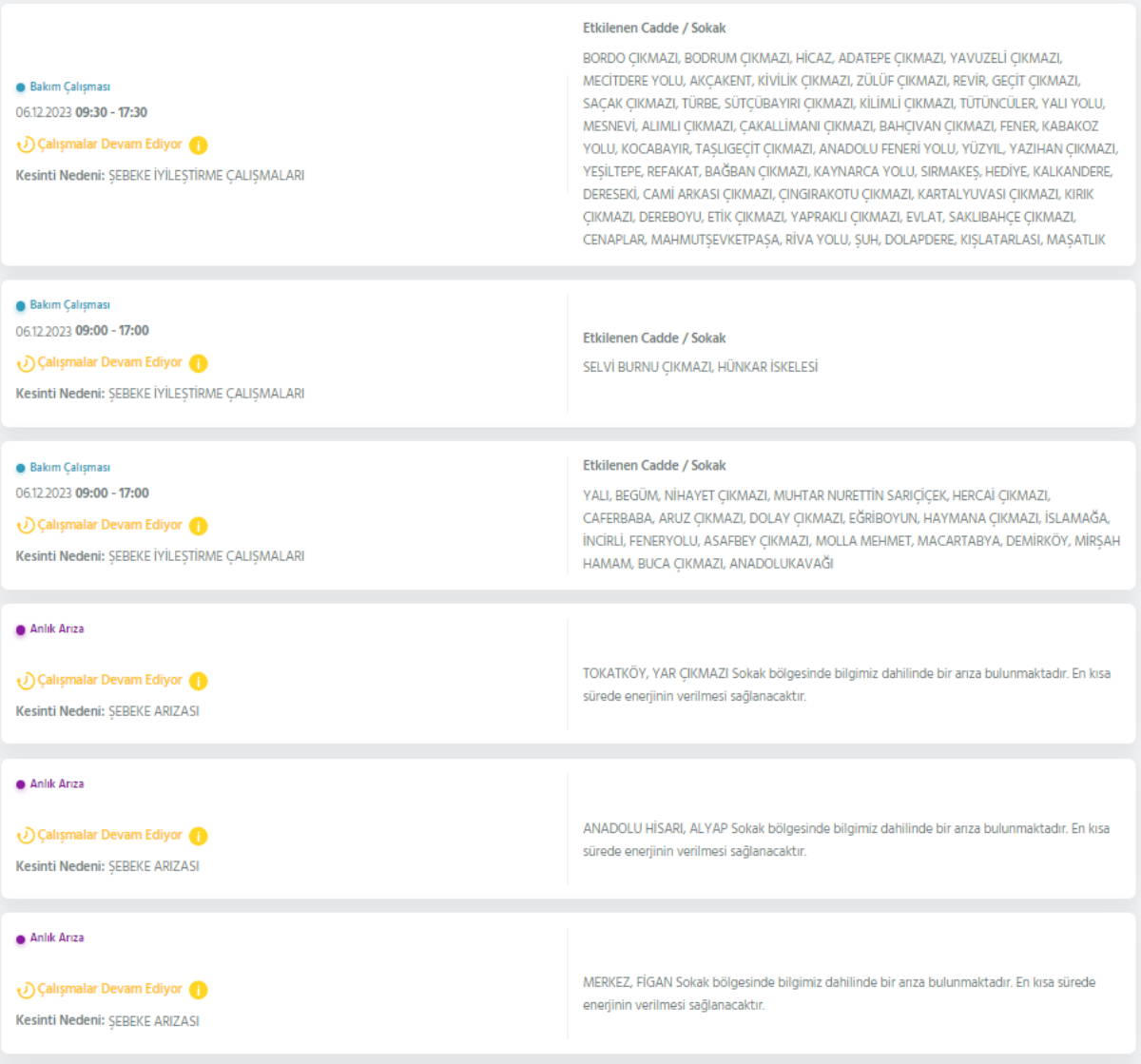 Boğaziçi Elektrik Dağıtım A.Ş, (BEDAŞ) İstanbul'da 6 Aralık Çarşamba günü elektrik kesintileri uygulanacak ilçe ve sokakları paylaştı. Yurttaşlar, nerede elektriklerin kesileceğini ve ne zaman geleceğini merak etti. Peki, İstanbul'da bugün elektrik kesintisi yaşanacak ilçeler hangileri? İstanbul'da elektrikler ne zaman gelecek?