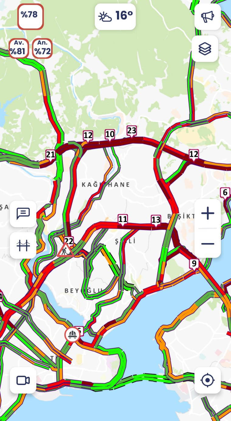 İBB'nin trafik yoğunluk haritasında saat 18.30 sıralarında yoğunluk yüzde 82'lere ulaştı.