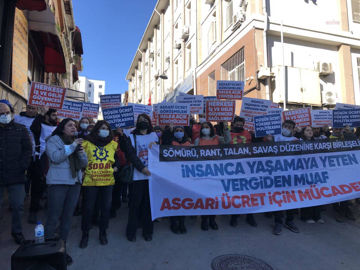 Kendilerine "Asgari Değil İnsanca Yaşam Mücadelesi Bileşenleri" adını veren bir grup vatandaş, Çalışma Bakanlığı'nın Tophane'de bulunan binasının önünde bugün bir araya geldi. Yurttaşlar, burada “Asgari değil insanca yaşam”, “Yaşasın sınıf dayanışması”, "Asgari ücret düzenine son” sloganları attı.