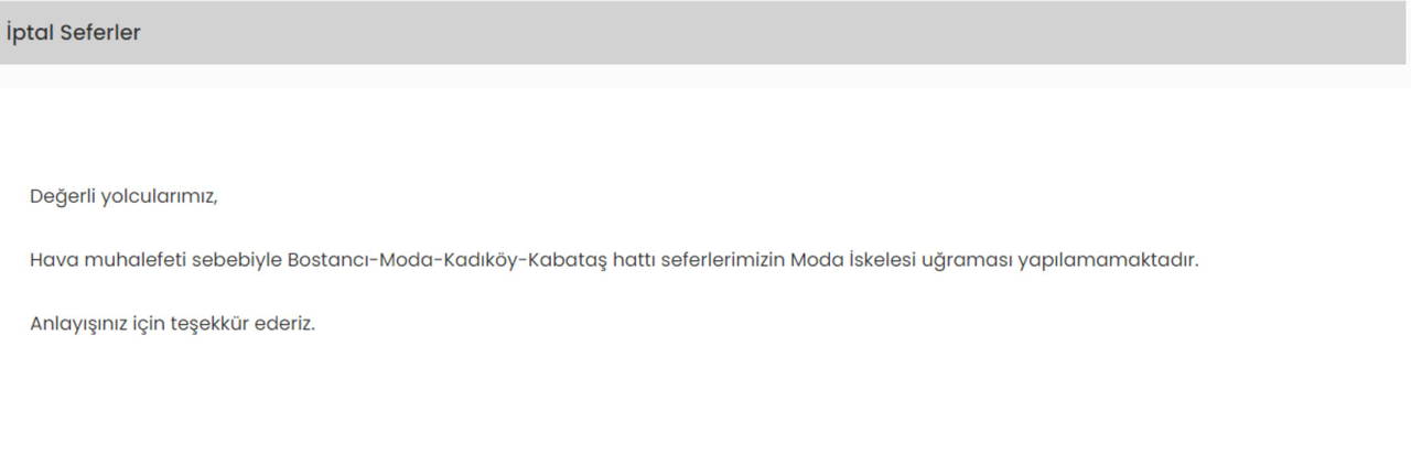 Şehir Hatları AŞ'nin internet sitesinden yapılan duyuruda, hava muhalefeti sebebiyle Bostancı-Moda-Kadıköy-Kabataş hattı seferlerinin Moda İskelesi uğramasının yapılamadığı bildirildi.(28 Mart 2023)