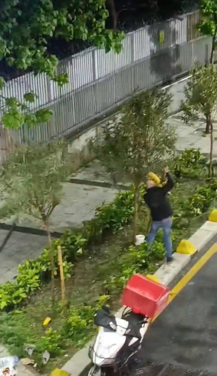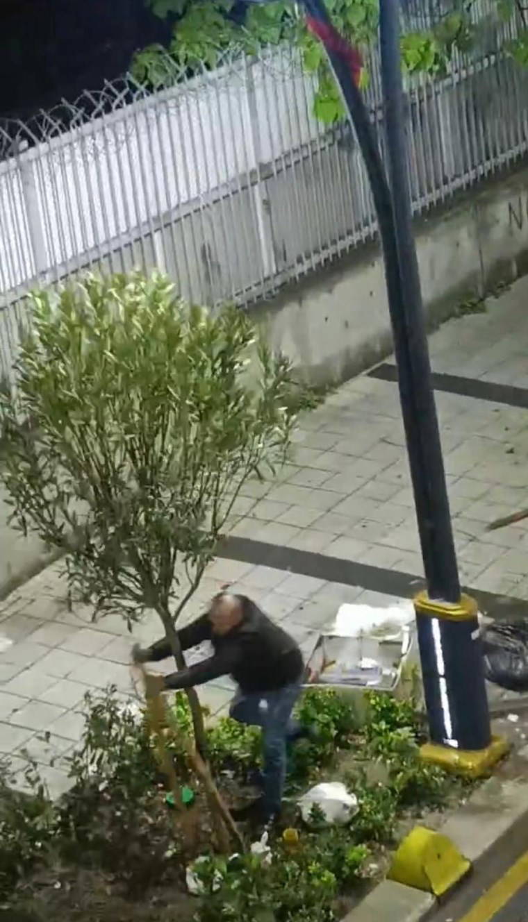 Elindeki tahta parçalarıyla ağaç dallarına vuran ve köklerini kazıyan adam ağaçlara büyük ölçüde zarar verdi.