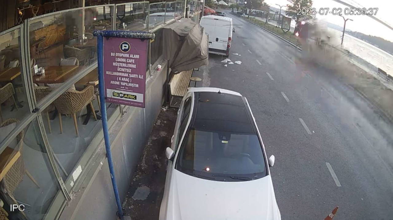 O esnada kafeteryada çalışan Abdullah Mintaş, yangın söndürme tüpüyle yangına müdahale etti. Sürücü de kazadan burnu bile kanamadan kurtuldu. Yaşanan feci kaza ise güvenlik kameralarına anbean yansıdı.