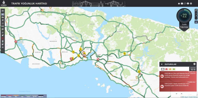 Trafiğin en yoğun olduğu, iş çıkış saati olan 18:30'da trafik yoğunluğu yüzde 22 olarak ölçüldü.