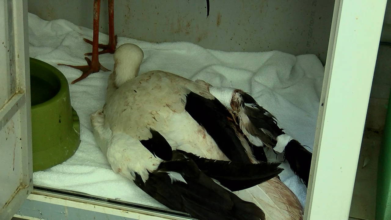 Silahla vurulmaya bağlı kanadında açık kırığı bulunan ve kanaması olan leylek tedavi altına alındı. Şu anda ilaç tedavisi gören leyleğin durumu kritik.