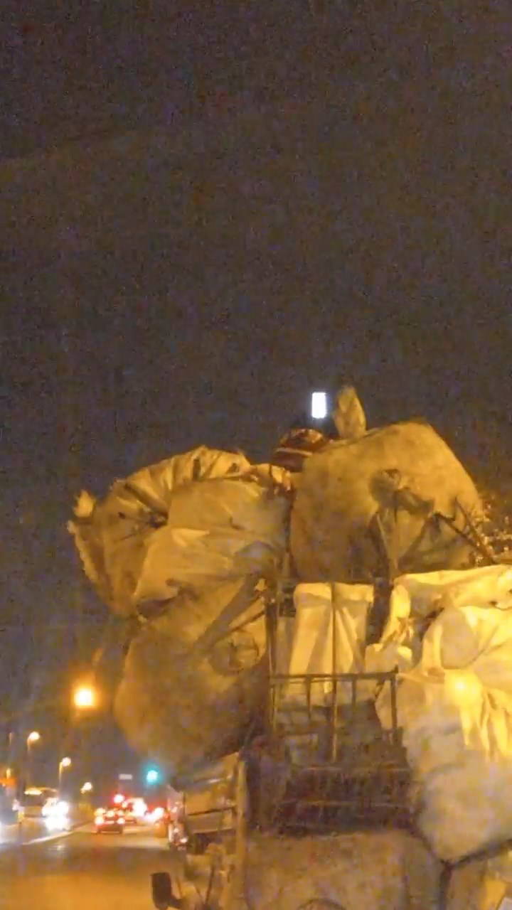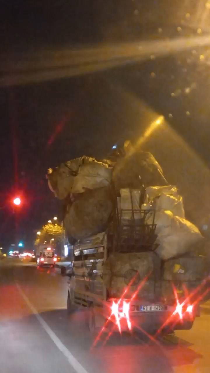 İstanbul Sancaktepe'de cep telefonu kamerasına yansıyan olayda, kasasında üst üste yüklenmiş atık çuvalların olduğu kamyonet tehlike saçtı.