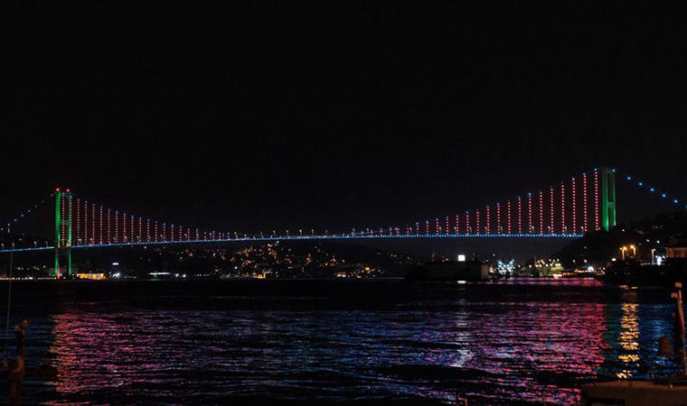 Azerbaycan'ın 28 Mayıs Bağımsızlık Günü nedeniyle 15 Temmuz Şehitler Köprüsü, Fatih Sultan Mehmet Köprüsü ve Yavuz Sultan Selim Köprüsü, Azerbaycan bayrağının renkleriyle ışıklandırıldı.