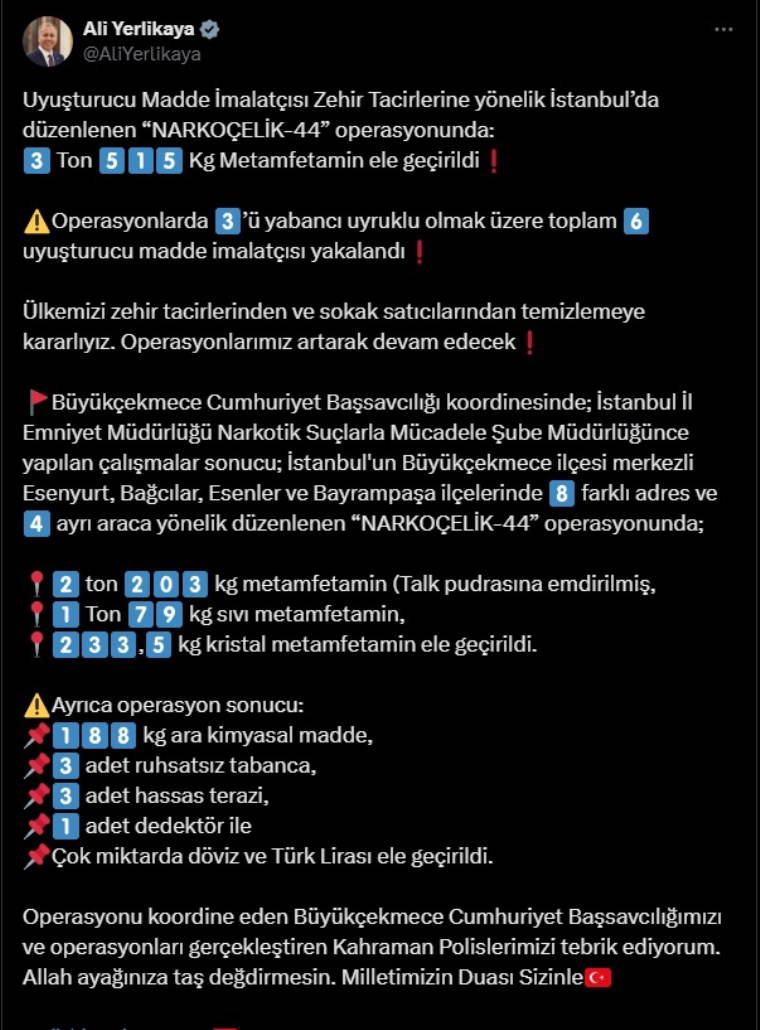 "Uyuşturucu madde imalatçısı zehir tacirlerine yönelik İstanbul'da düzenlenen “Narkoçelik-44' operasyonunda: 3 Ton 515 Kg Metamfetamin ele geçirildi. Operasyonlarda 3'ü yabancı uyruklu olmak üzere toplam 6 uyuşturucu madde imalatçısı yakalandı. Ülkemizi zehir tacirlerinden ve sokak satıcılarından temizlemeye kararlıyız. Operasyonlarımız artarak devam edecek. Büyükçekmece Cumhuriyet Başsavcılığı koordinesinde; İstanbul İl Emniyet Müdürlüğü Narkotik Suçlarla Mücadele Şube Müdürlüğünce yapılan çalışmalar sonucu; İstanbul'un Büyükçekmece ilçesi merkezli Esenyurt, Bağcılar, Esenler ve Bayrampaşa ilçelerinde 8 farklı adres ve 4 ayrı araca yönelik düzenlenen 'Narkoçelik-44' operasyonunda; 2 ton 203 kilogram metamfetamin (Talk pudrasına emdirilmiş), 1 Ton 79 kilogram sıvı metamfetamin, 233,5 kilogram kristal metamfetamin ele geçirildi. Ayrıca operasyon sonucu 188 kilogram ara kimyasal madde, 3 adet ruhsatsız tabanca, 3 adet hassas terazi, 1 adet dedektör ile çok miktarda döviz ve Türk lirası ele geçirildi. Operasyonu koordine eden Büyükçekmece Cumhuriyet Başsavcılığımızı ve operasyonları gerçekleştiren Kahraman Polislerimizi tebrik ediyorum."