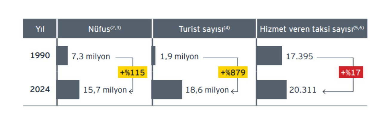 Son 30 yılda İstanbul’un nüfusu iki katına, turist sayısı ise 10 katına çıkarken, taksi sayısında sadece yüzde 17 oranında bir artış oldu. Bu durum, şehrin taksi talebine yeterli arzı sunamadığını ve korsan taksi kullanımının yaygınlaştığını gösteriyor. Yurttaşların yüzde 86’sı taksi bulmakta zorlandığını belirtirken, yüzde 33’ü her zaman taksi bulamama sorunu yaşadığını ifade ediyor.