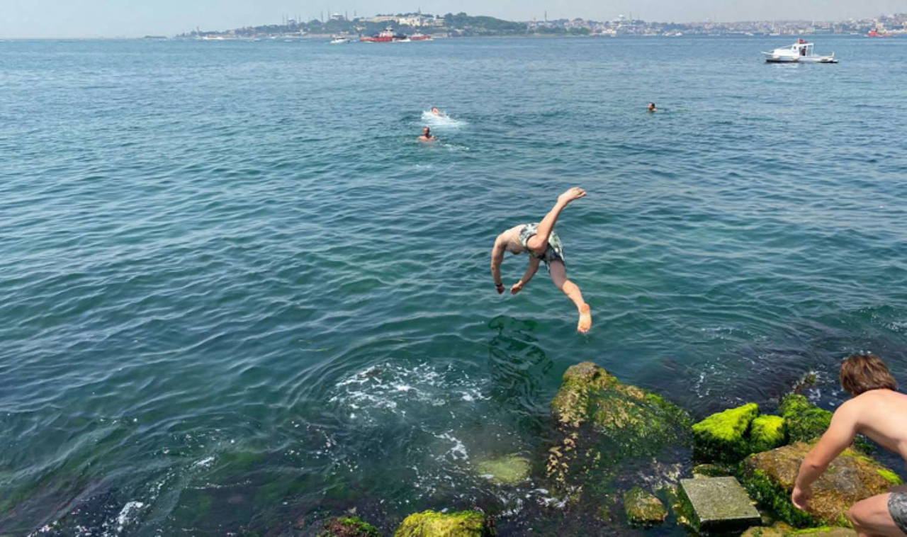 Son günlerde hava sıcaklıklarının artmasıyla birlikte İstanbullular serinlemek için sahillere akın etti. Sıcaktan bunalıp soluğu Üsküdar sahilinde alan erkekler denize girerek serinledi.