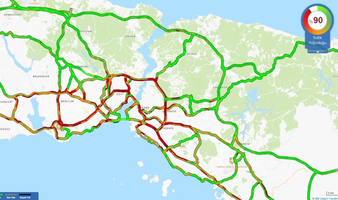İBB'nin haritasına göre saat 17.00 itibarıyla trafik yoğunluğu yüzde 90'a ulaştı. Trafik yoğunluğunun mesai bitiminde daha da artması bekleniyor.