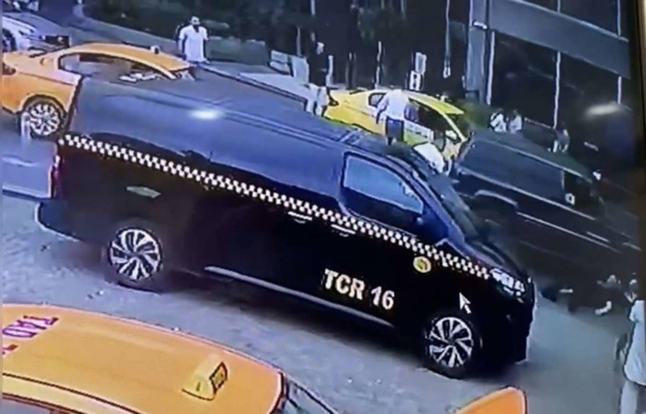 Başını asfalta çarpan adam olduğu yerde hareketsiz şekilde kalırken, taksici ise aracına binerek kaçtı. Yaşananlar ise güvenlik kameralarına anbean yansıdı.