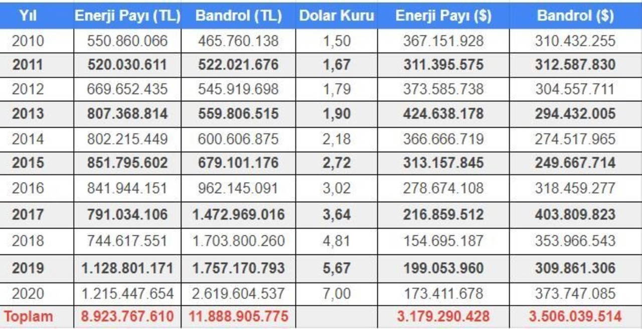 TRT’nin verdiği cevapta dolar kuru üzerinden paylaşılan tablolara göre, 2010 – 2020 yılları arasında vatandaşın elektrik faturalarından 3 milyar 179 milyon 290 bin dolar, satın aldığı cihazlardan ise bandrol geliri adı altında 3 milyar 506 milyon 39 bin lira toplandı. Söz konusu 11 yıllık dönemde toplanan toplam miktar 6 milyar 685 milyon 329 bin dolar oldu.