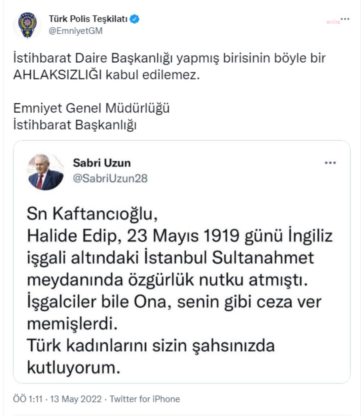 Emniyet Genel Müdürlüğü İstihbarat Başkanlığı; Yargıtay'ın hakkındaki mahkûmiyet kararları onanan CHP İstanbul İl Başkanı Kaftancıoğlu’na destek mesajı yayınlayan eski İstihbarat Dairesi Başkanı Sabri Uzun’a tepki gösterdi.