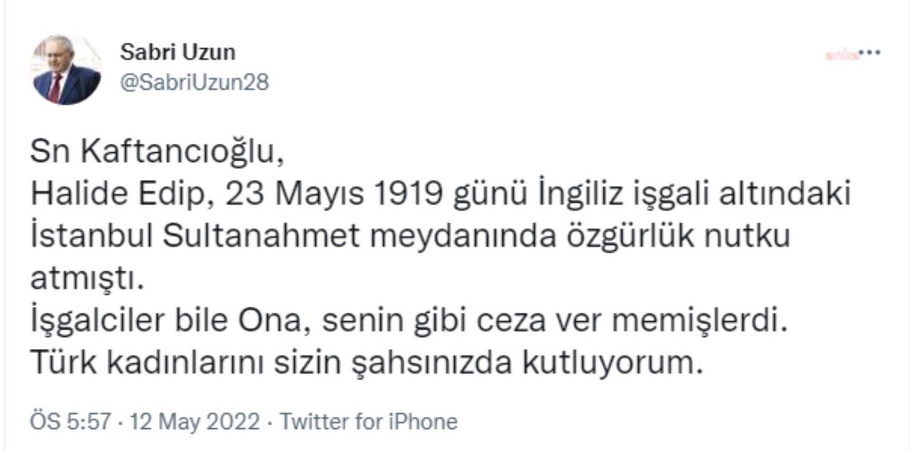 “Sayın Kaftancıoğlu, Halide Edip, 23 Mayıs 1919 günü İngiliz işgali altındaki İstanbul Sultanahmet meydanında özgürlük nutku atmıştı. İşgalciler bile ona, senin gibi ceza vermemişlerdi. Türk kadınlarını sizin şahsınızda kutluyorum.”