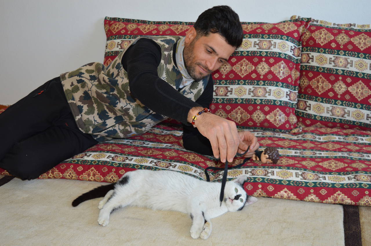 Kediyi kurtarma çalışmalarında görev yapan itfaiye eri Ali Çakas sahiplendi. Çakas, Mardin'e getirdiği kediye özenle bakıyor.