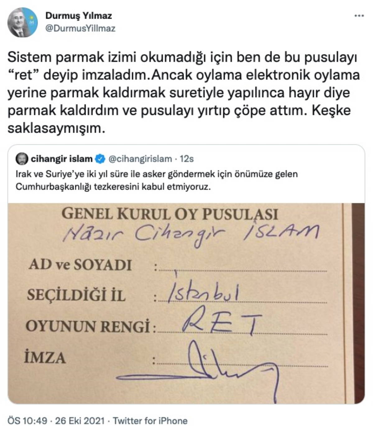 CHP İstanbul Milletvekili Cihangir İslam'ın oy pusulasını paylaştığı tweeti alıntılayan Yılmaz, "Sistem parmak izimi okumadığı için ben de bu pusulayı "ret" deyip imzaladım. Ancak oylama elektronik oylama yerine parmak kaldırmak suretiyle yapılınca 'Hayır' diye parmak kaldırdım ve pusulayı yırtıp çöpe attım. Keşke saklasaymışım" ifadelerini kullandı.