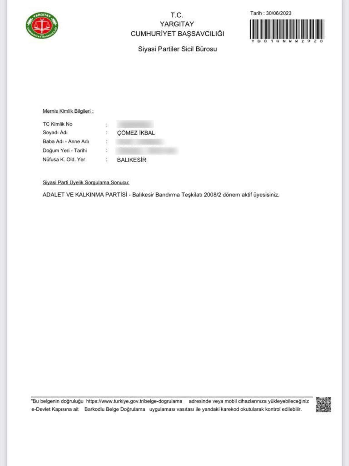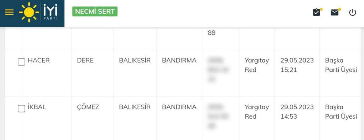 Sosyal medyadan annesi ve ablasının AKP’ye üye yapıldığı belgeyi paylaşan Turhan Çömez, “Annem ve ablam hayatlarında ilk kez bir siyasi partiye üye olmak için başvuru yaptı. Tabii ki, İYİ Parti’ye. Ancak Yargıtay üyeliklerini reddetti. Meğer AK Parti kimlik bilgilerini ele geçirip sahte üyelik yapmış" dedi.