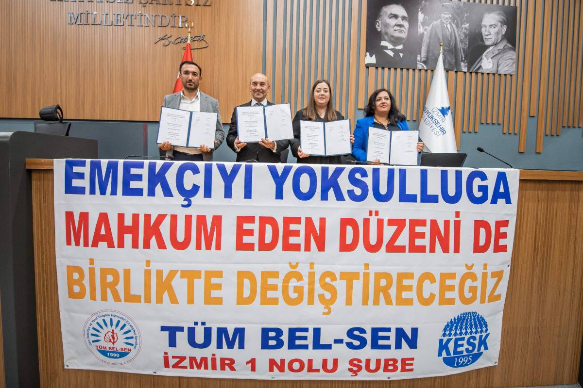 İzmir Büyükşehir Belediyesi ile Kamu Emekçileri Sendikaları Konfederasyonu’na (KESK) bağlı Tüm Belediye ve Yerel Yönetim Hizmetleri Emekçileri Sendikası (Tüm Bel-Sen) İzmir 1 No’lu Şubesi arasında yürütülen toplu iş sözleşmesi görüşmesi sonuçlandı. İzmir Büyükşehir Belediyesi, İZSU ve ESHOT bünyesinde çalışan yaklaşık 6 bin memur, Kültürpark 4 No’lu Hol’de bulunan Meclis Salonu’nda sözleşmenin imza töreni için bir araya geldi. Memurlara yaklaşık yüzde 70 oranında zam yapıldı.