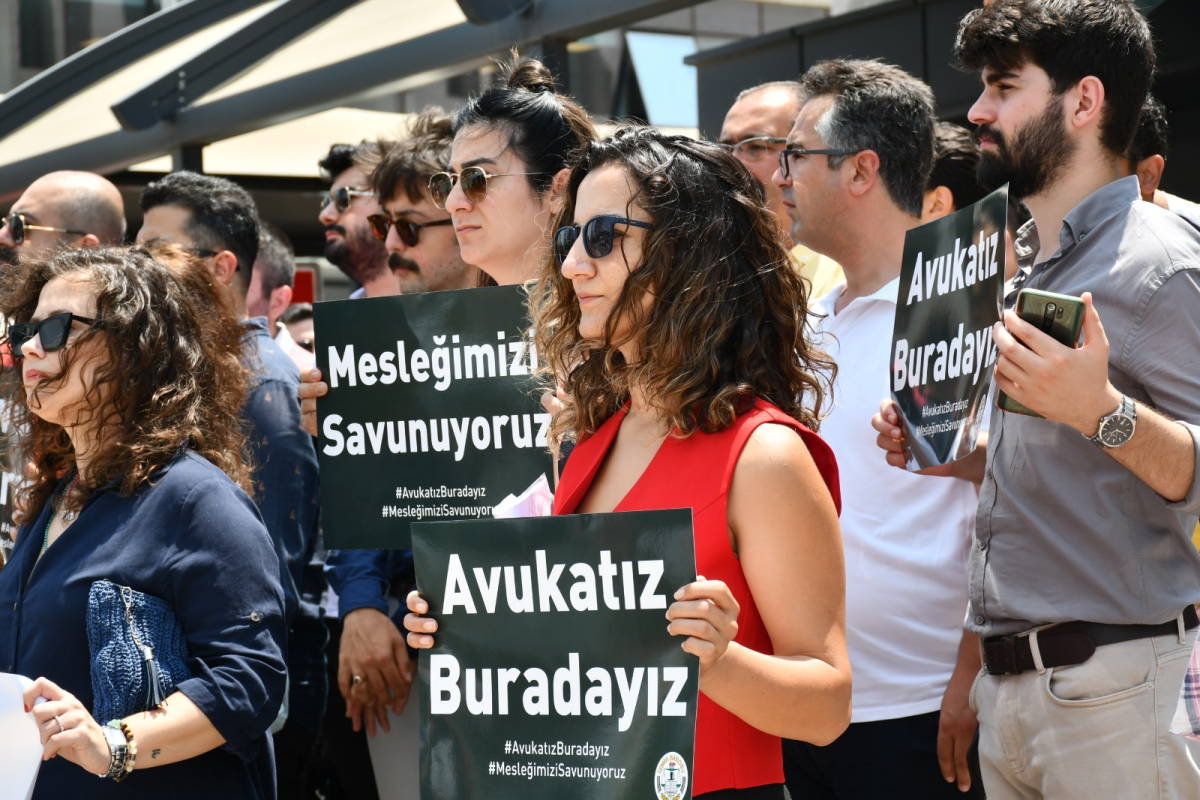 “Avukatlığı itibarsızlaştırmanıza, avukatları yoksullaştırmanıza karşı söyleyecek sözümüz, hakkımızı alacak gücümüz var!” yazan pankart açan avukatlar görüşme öncesi 15 maddelik taleplerini sıraladı.